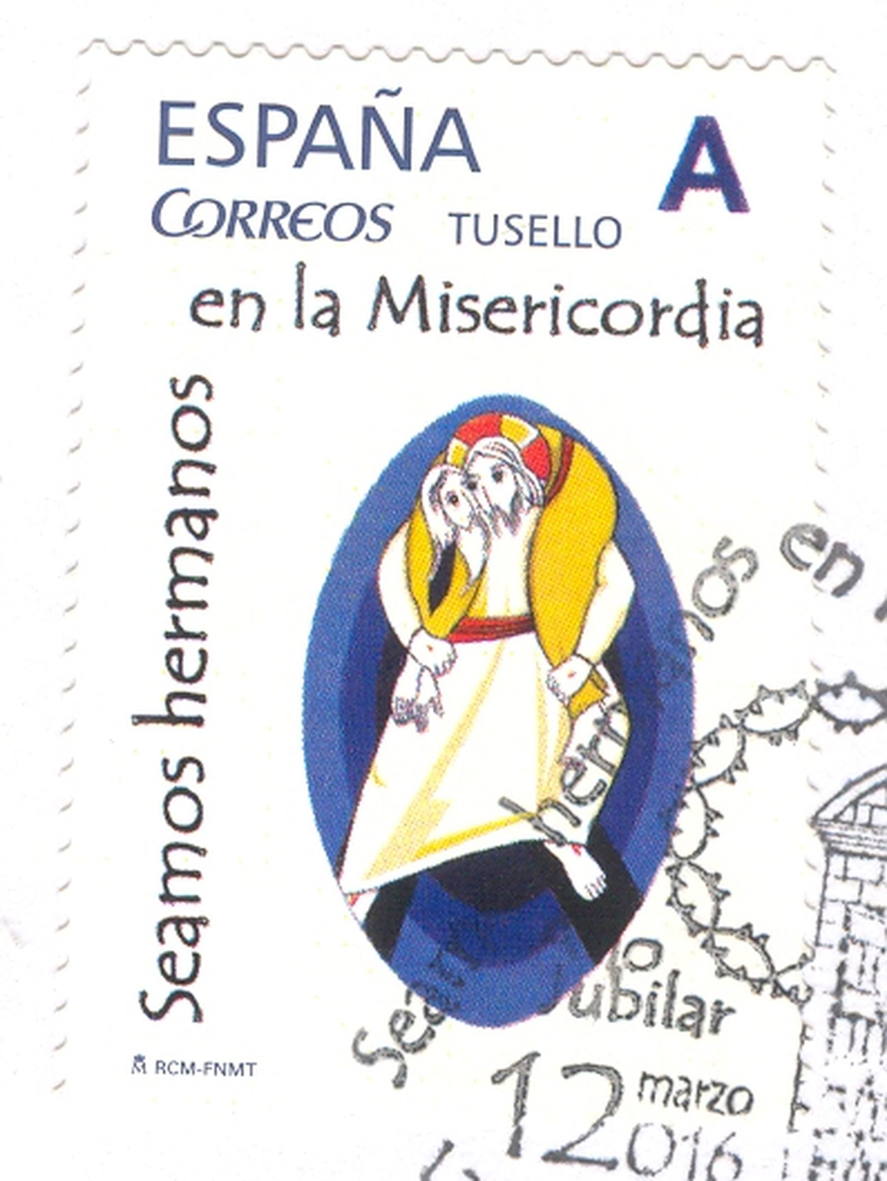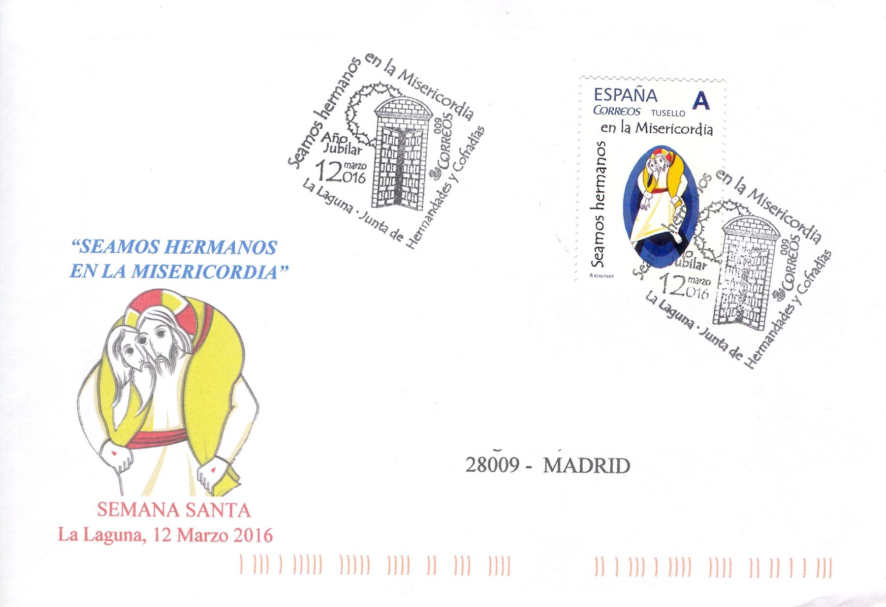 Y ahora, gracias a un buen amigo, reproduzco en este mensaje el sello personalizado (TU SELLO) emitido en La Laguna, con ocasión de su Semana Santa, con el lema "Seamos hermanos en la Misericordia".