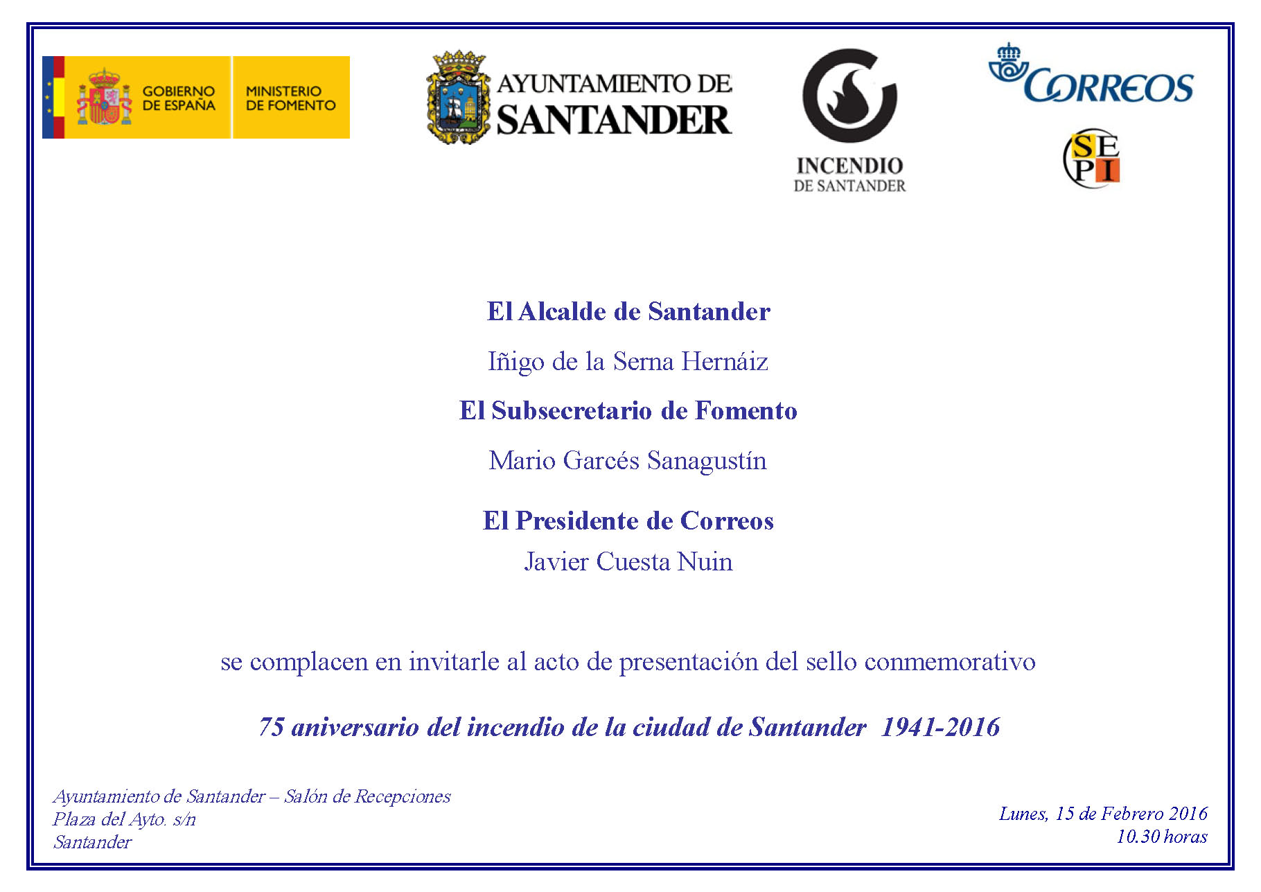 Reproduzco la invitación que, en este sentido, han cursado el Alcalde de Santander, Íñigo de la Serna Hernáiz; el Subsecretario de Fomento, Mario Garcés Sanagustín; y el Presidente de Correos, Javier Cuesta Nuin.
