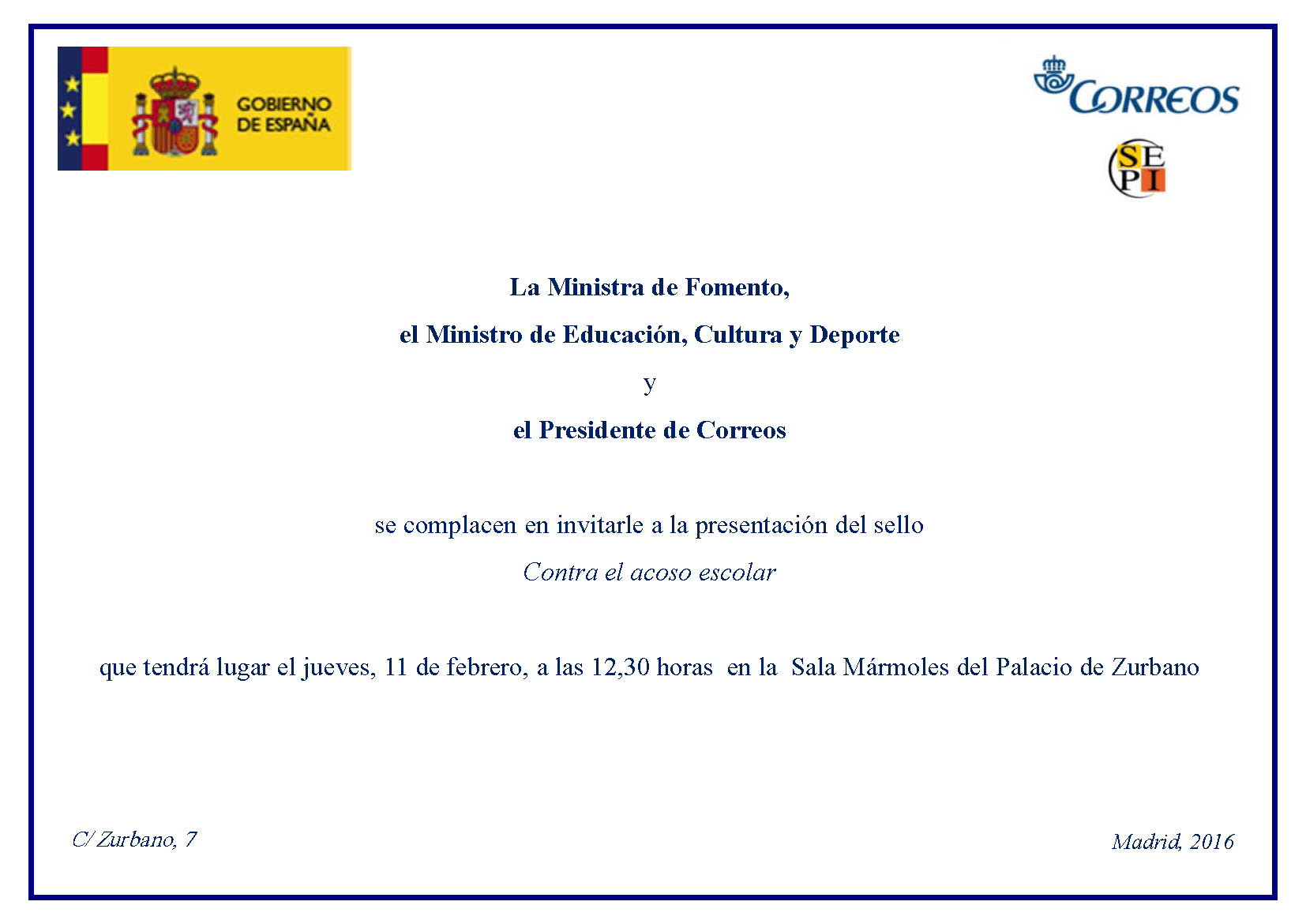 Reproduzco la invitación que, en este sentido, han cursado la Ministra de Fomento; el Ministro de Educación, Cultura y Deporte; y el Presidente de Correos.