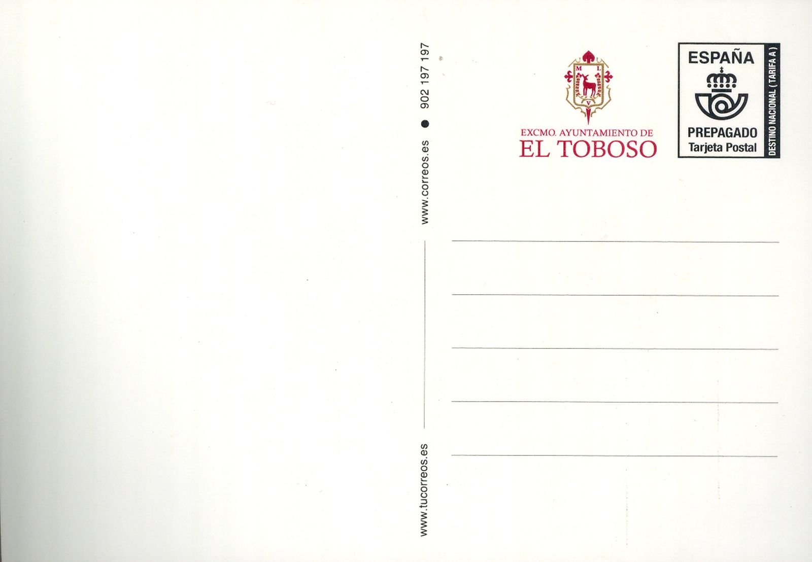Siguiendo con la catalogación de estos atractivos, curiosos y esquivos productos (especialmente por si no se catalogan en los catálogos al uso), reproduzco la "Tarjeta Postal Prepagado", en su modalidad "Destino Nacional (Tarifa A)" y "Destino Resto del Mundo (Tarifa C)", emitidas por Correos a solicitud del Ayuntamiento de El Toboso, Toledo.