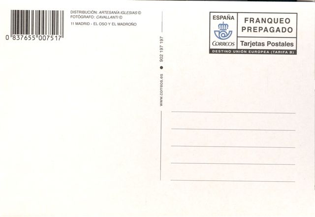 Reproduzco el anverso y reverso de la última tarjeta postal con franqueo prepagado que me quedaba para completar la serie de las dieciséis emitidas en Madrid. Es la siguiente: