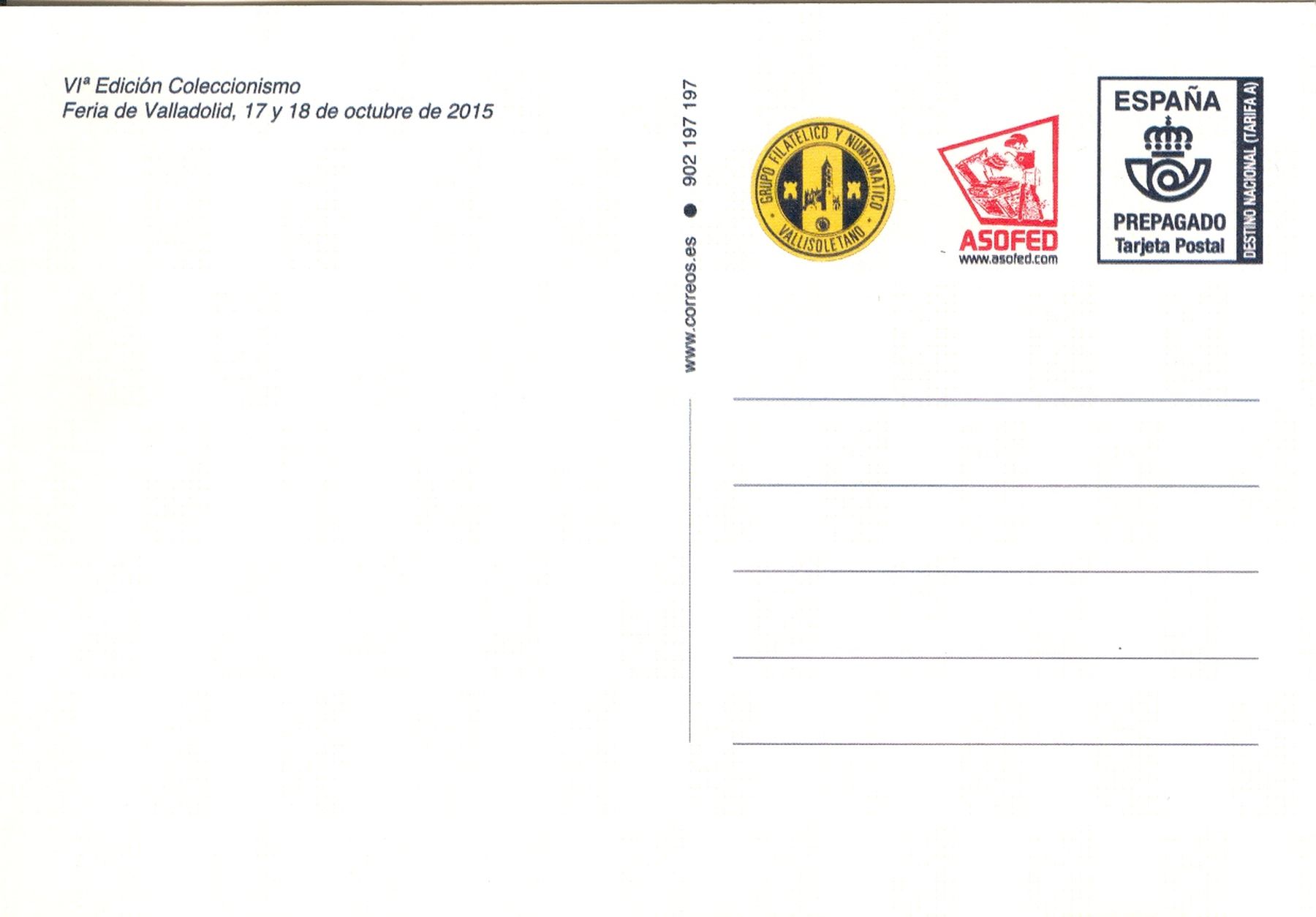 Siguiendo con la catalogación de estos atractivos, curiosos y esquivos productos (especialmente por si no se catalogan en los catálogos al uso) reproduzco la "Tarjeta Postal Prepagado", en su modalidad "Destino Nacional (Tarifa A)", emitida con ocasión de la la "VI.ª Edición Coleccionismo", celebrada en la Feria de Valladolid los días 17 y 18 de octubre del año 2015.