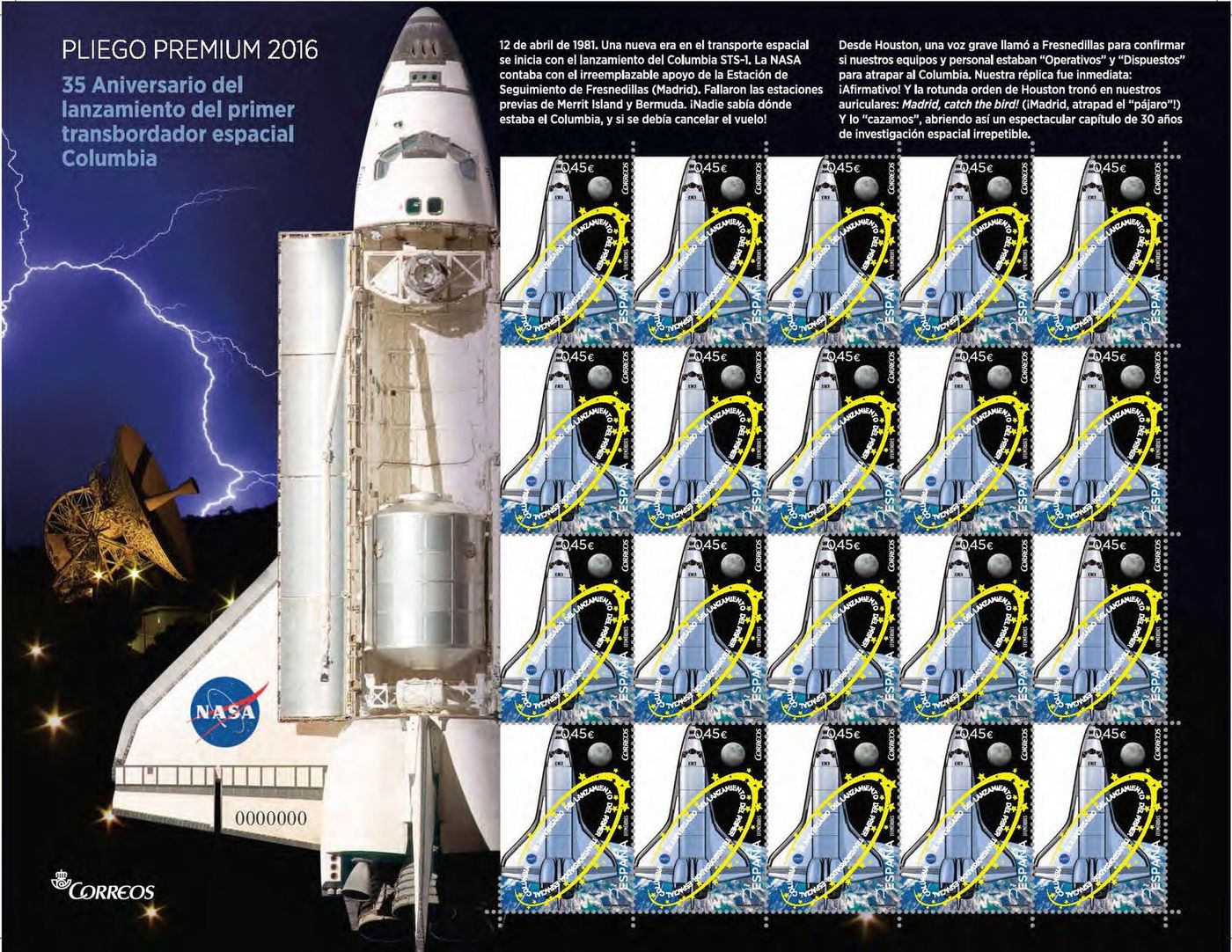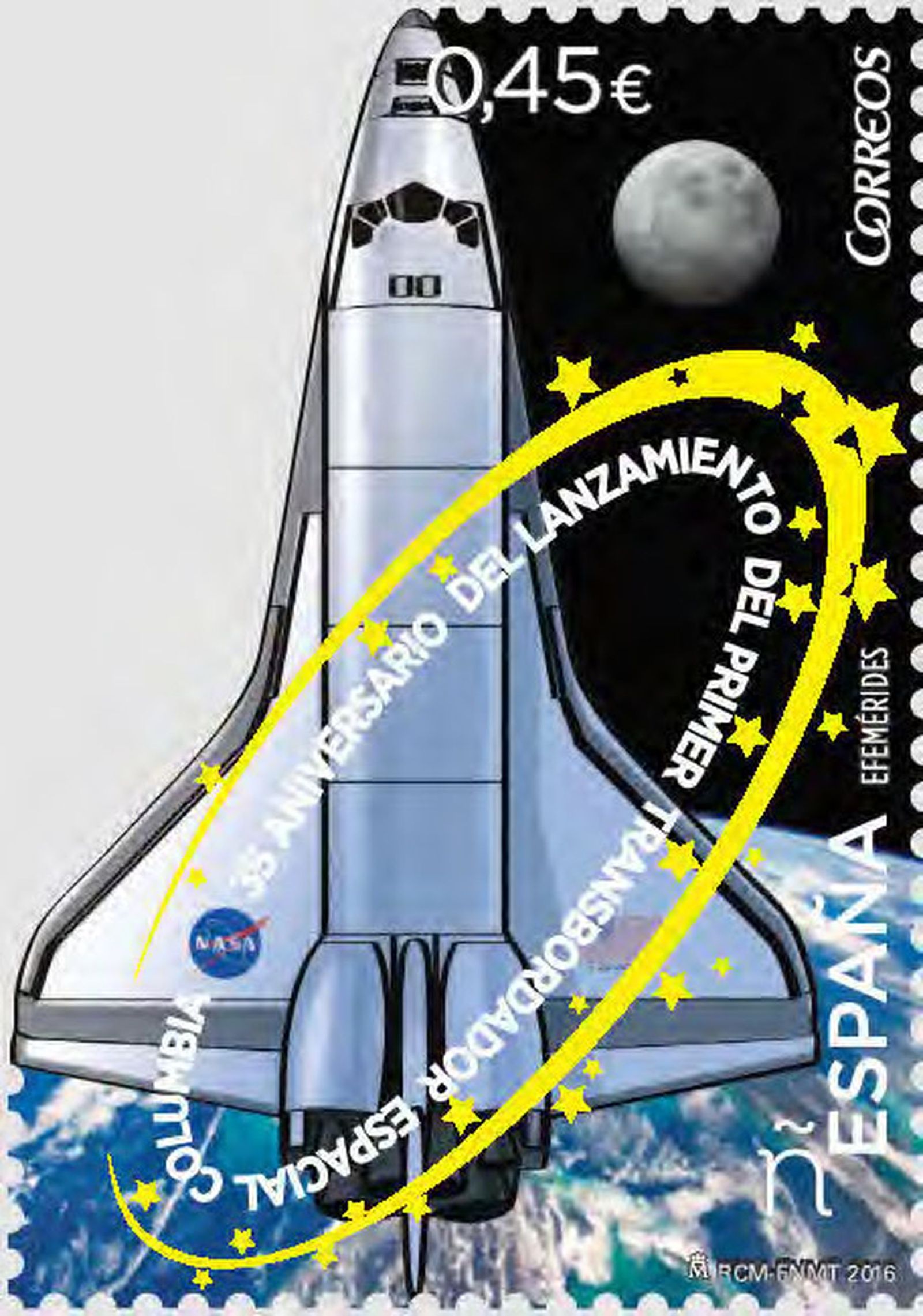 El sello que se emite para conmemorar los 35 años de su primer lanzamiento, tiene un corte original con la forma del transbordador. En la imagen, se ve la nave con la Tierra al fondo vista desde el espacio junto a la Luna. El texto “35 aniversario del lanzamiento del primer transbordador espacial Columbia”, acompañado del logotipo de la NASA, parece dibujar una órbita espacial y puede leerse tanto en vertical como en horizontal.