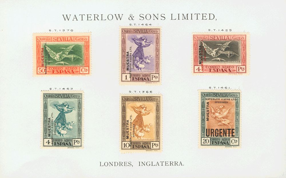 Para que nos hagamos idea de cómo eran los libros de muestras comerciales de Waterlow & Sons, muestro las hojas que han llegado íntegras a nuestros días (con los sellos sin lavar) de la emisión Quinta de Goya de 1930. Es habitual encontrar estas muestras comerciales en hojas mezcladas con sellos de diferentes países impresos en la firma londinense:
