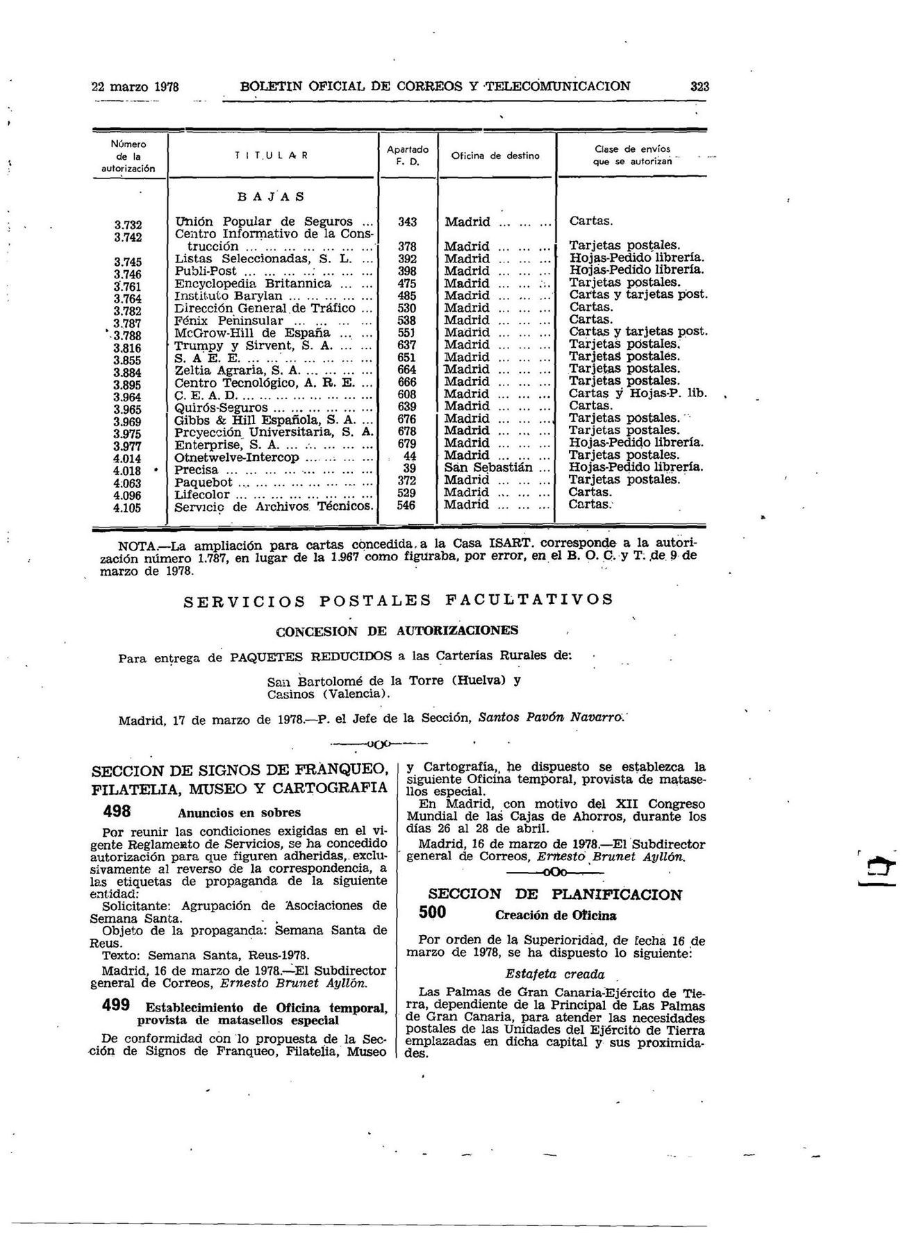 Esta autorización se publicó en la página 323 del Boletín Oficial de Correos y Comunicaciones del 22/03/1978, correspondiente al número 14 del mismo.