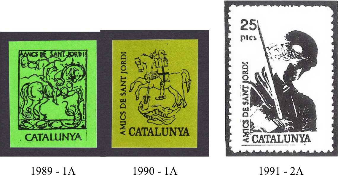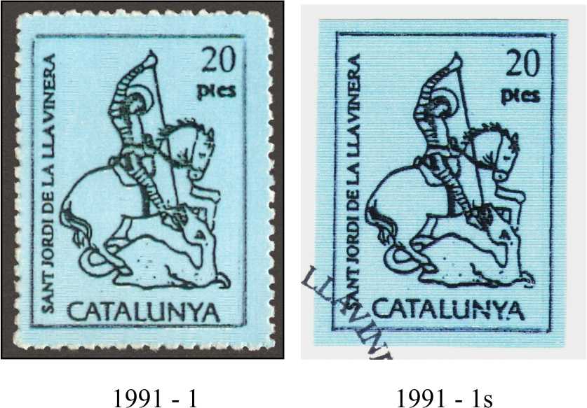 A su vez en algunos años existen versiones dentadas y sin dentar,,,, muestro la viñeta para 1991 dedicada a Sant Jordi de la Llavinera.