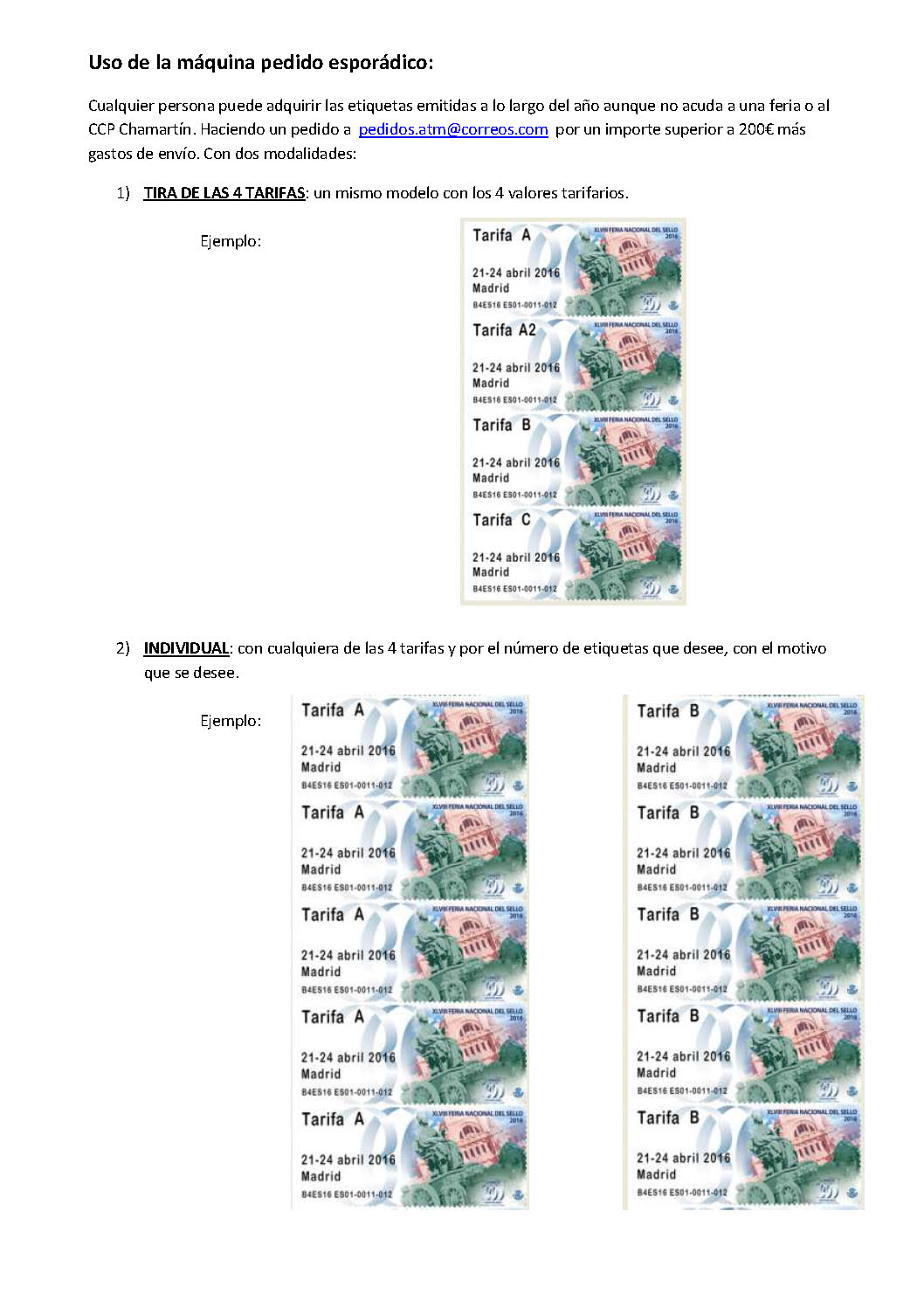 Uso de la máquina pedido esporádico: Cualquier persona puede adquirir las etiquetas emitidas a lo largo del año aunque no acuda a una feria o al CCP Chamartín. Haciendo un pedido a pedidos.atm@correos.com por un importe superior a 200€ más gastos de envío. Con dos modalidades (ver detalles en archivo adjunto):