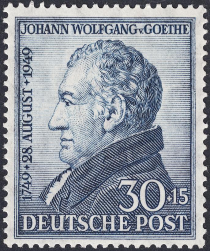Goethe es con justicia, y como no podía ser de otro modo, el escritor al que más sellos ha dedicado la filatelia alemana. Mostramos primero este de la serie de tres sellos calcográficos de 1949, conmemorando el bicentenario de su nacimiento. Más adelante mostraremos otros. Grabado a partir de uno de sus retratos más conocidos: el óleo sobre lienzo de Johann H. Wilhelm Tischbein, Goethe en la campiña romana.