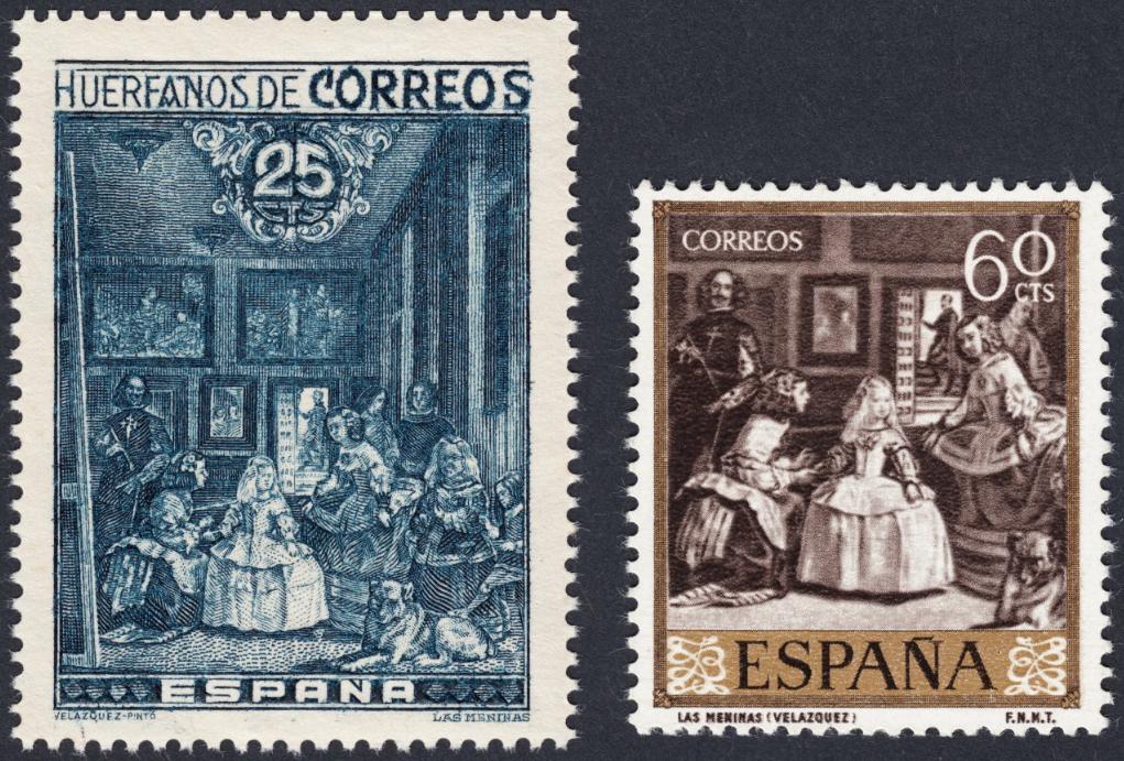 Debajo de estas líneas hay imágenes que enseguida hasta la intuición más perezosa habrá relacionado de inmediato con las palabras titulares de este texto. En efecto, si acercamos la palabra "recreación" al sello calcográfico de Las Meninas, habremos vislumbrado sin apenas esfuerzo no ya en la lejanía del horizonte, sino bien cerca, el puerto en el que queremos fondear. El grabador de este sello "recrea" la obra de Velázquez, no copia ni reproduce. Y no la crea cabalmente porque no supera el punto desde donde parte, la referencia, en este caso una gran cima casi imposible de rebasar. El sello de la derecha, sin embargo, no es una recreación, es decir, no tiene el mérito modesto y admirable de ser un ensayo creador: es sólo una reproducción, una copia de esa referencia. Ni qué decir tiene que en el plano sobre el que ahora mismo deslizamos y confrontamos estas deducciones, ninguna importancia tiene el por lo demás indiscutible valor postal y filatélico de ambas piezas.