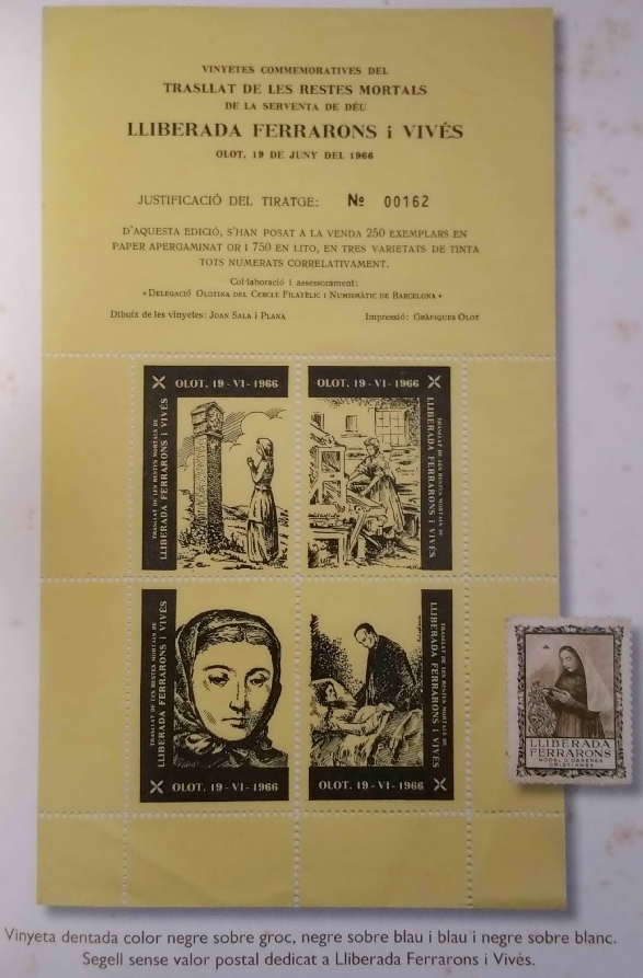 hojita de 1966 del Circulo de Olot, dedicada al traslado de los restos mortales de Lliberada Ferrarons, adjunta a otra viñeta religiosa de la misma Santa.