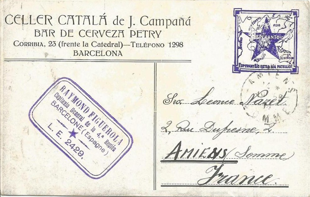 La segunda es una viñeta esperantista, preimpresa o en tampon sobre tarjeta circulada a Francia desde Barcelona...del celler Catalá, Bar Petry