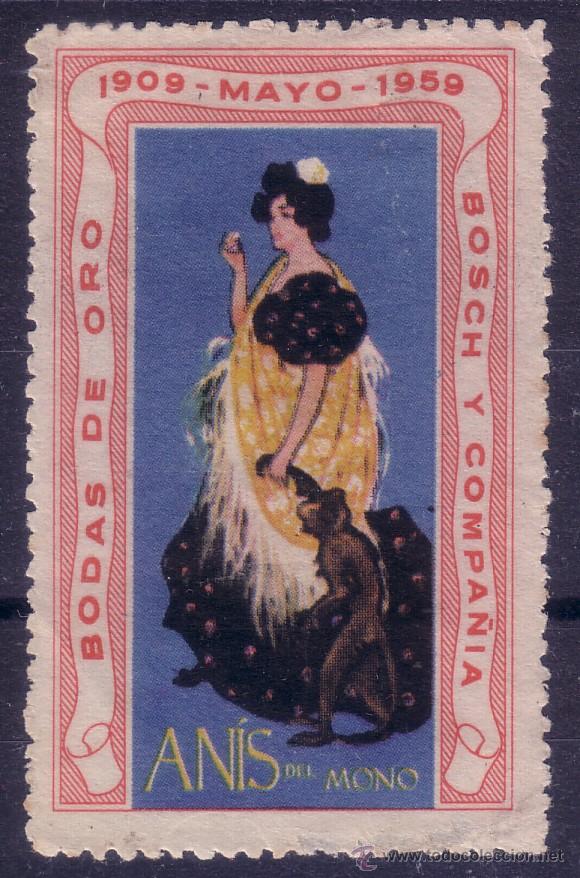 La segunda, ANIS DEL MONO, Viñeta realizada a partir del cartel de Ramon Casas de 1879,......... en conmemoración de las Bodas de Oro (o 50 aniversario) de la marca Bosch. Sede central en BADALONA. como Bosch y Grau en 1870, después conocida como Bosch y Cia. Esta realizada en el año 1959.