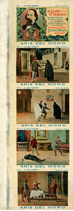 La primera es una tira de imagenes de Anis del mono, de D. Juan Tenorio, donde aparece también la mención del Sr. Vicente Bosch (Badalona). Tal vez no sean viñetas y sean cromos en tira continuos o troquelados para poderlos separar......... eso queda ahi.
