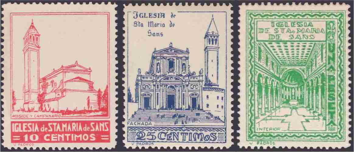 De este tipo Pro-Iglesia de Sans hay al menos el 10 y el 25 céntimos además del 1 peseta. la duda la tengo con V. Padrós, pues no se si puede ser el dibujante o la Imprenta,,, o los dos.