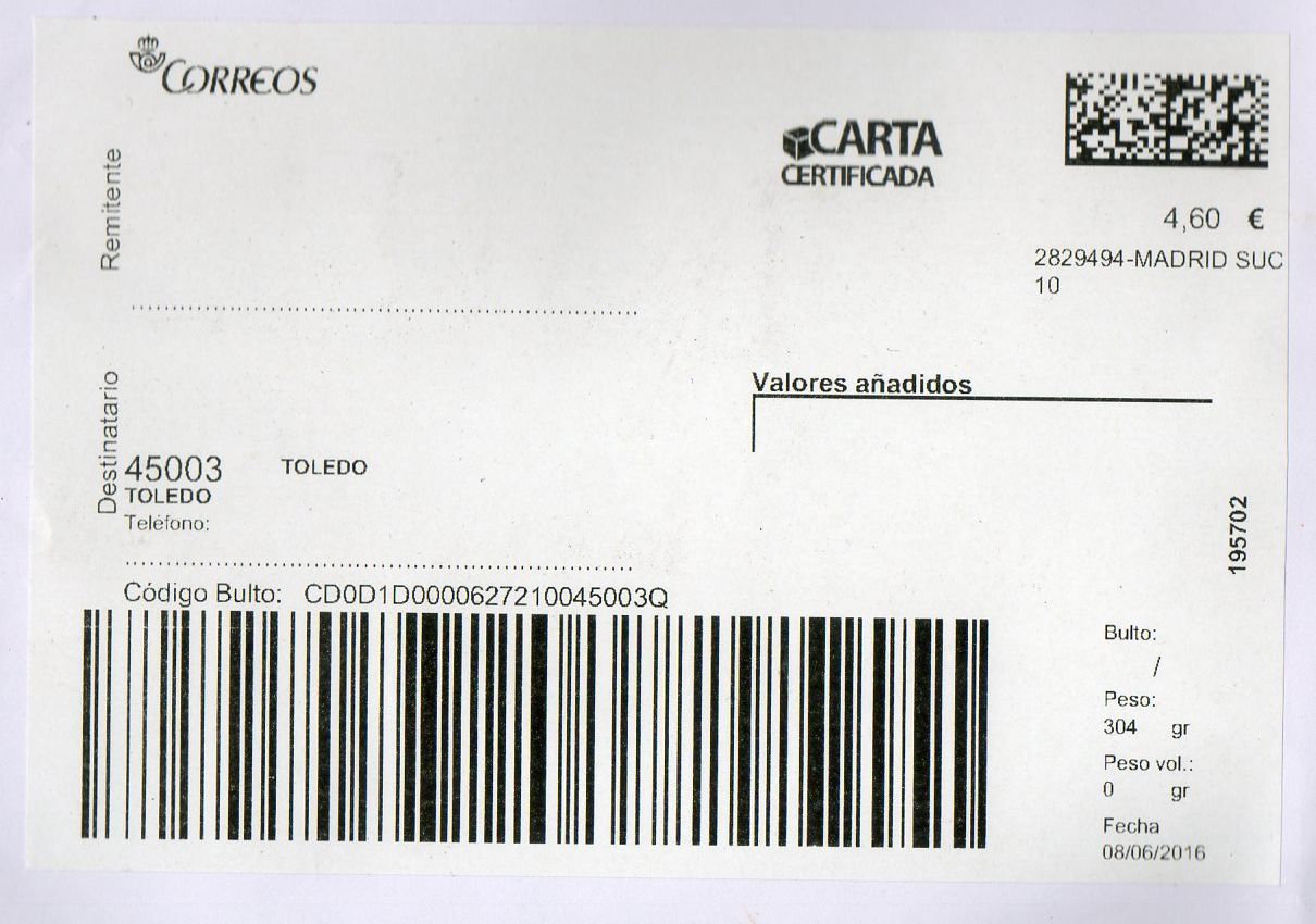 2829494-MADRID SUC 10 / CARTA CERTIFICADA / 08-06-16.