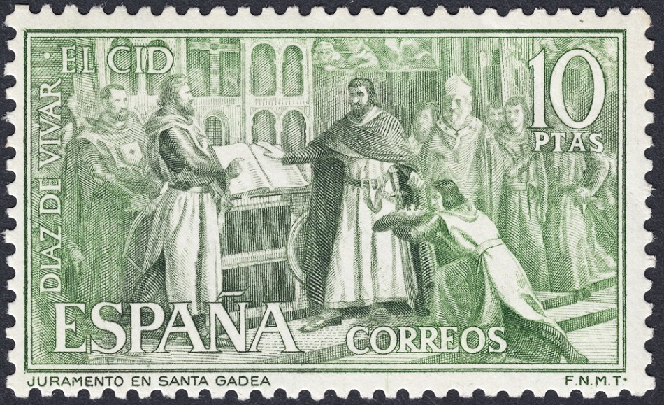 De unos años antes es la serie dedicada al Cid, sin duda una de las más emblemáticas del II Centenario. Los cuatro grabados fueron realizados por José Luis Sánchez Toda, entonces en plena madurez. Mostramos El juramento en Santa Gadea, a partir de una obra de Marcos Hiráldez Acosta de 1864, expuesta en el Senado de Madrid.