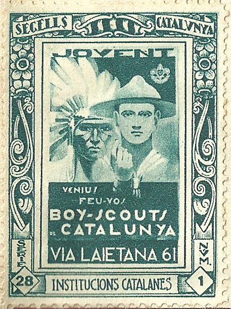 De hecho, en Catalunya, el movimiento scout ("escolta" en catalán) siempre ha funcionado básicamente a través de organizaciones estrictamente catalanas, como la de la viñeta que se muestra, emitida en 1933, en el Àlbum Catalunya.