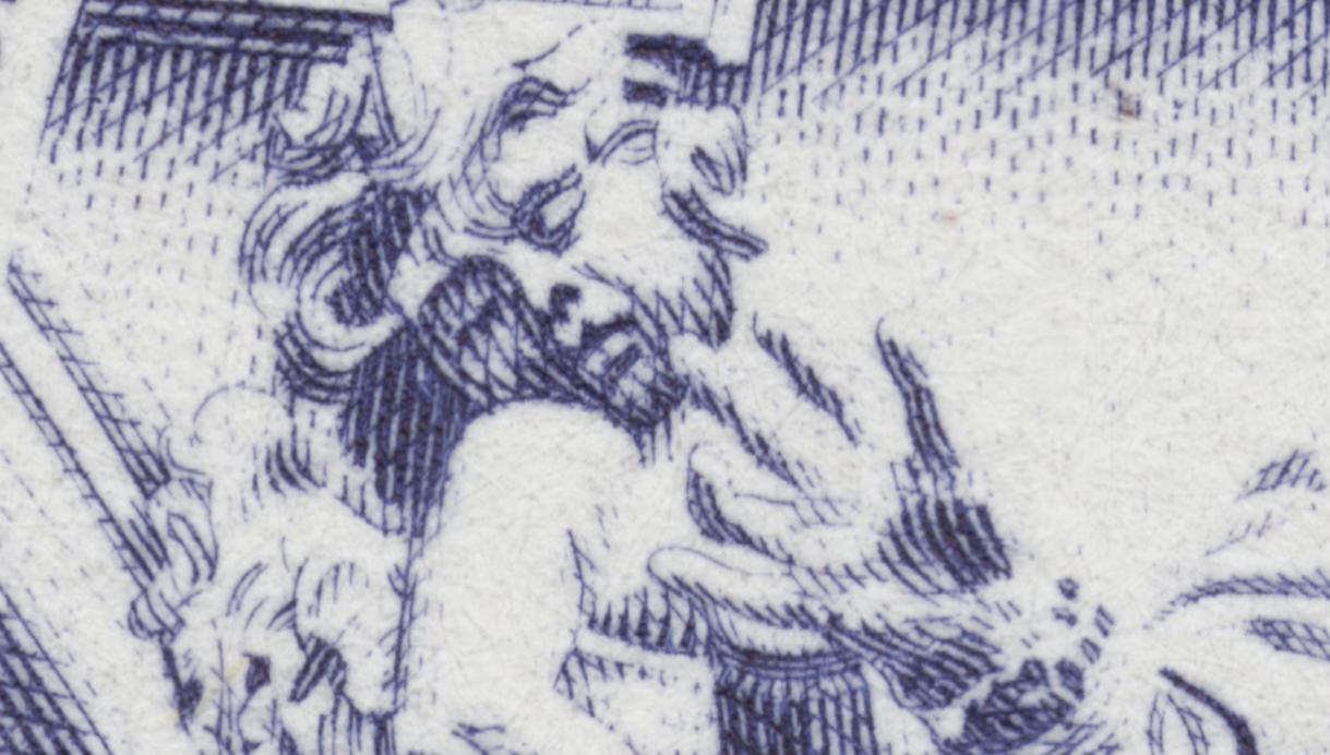 Yo sólo tengo ahora mismo el primer sello, el emitido en 1945, del que precisamente no estoy seguro de lo que se dice en el artículo citado: "... la mano de José Moreno puso su personal sello en los centros...". ¿Quiere esto decir que el grabado es suyo, o que sólo lo retocó? He aquí la primera duda. Las otras dos imágenes son de la red. A la vista de éstas, parece evidente que son tres grabados distintos; la última instantánea corresponde al grabado del billete. Incluso comparando sólo los sellos, hasta se puede apreciar la mejora técnica que obraron los veinte años transcurridos entre una y otra talla, si ambas fueron de Moreno Benavente, repito. En la siguiente entrada muestro la obra original inspiradora del sello y un recreo visual más completo de éste.