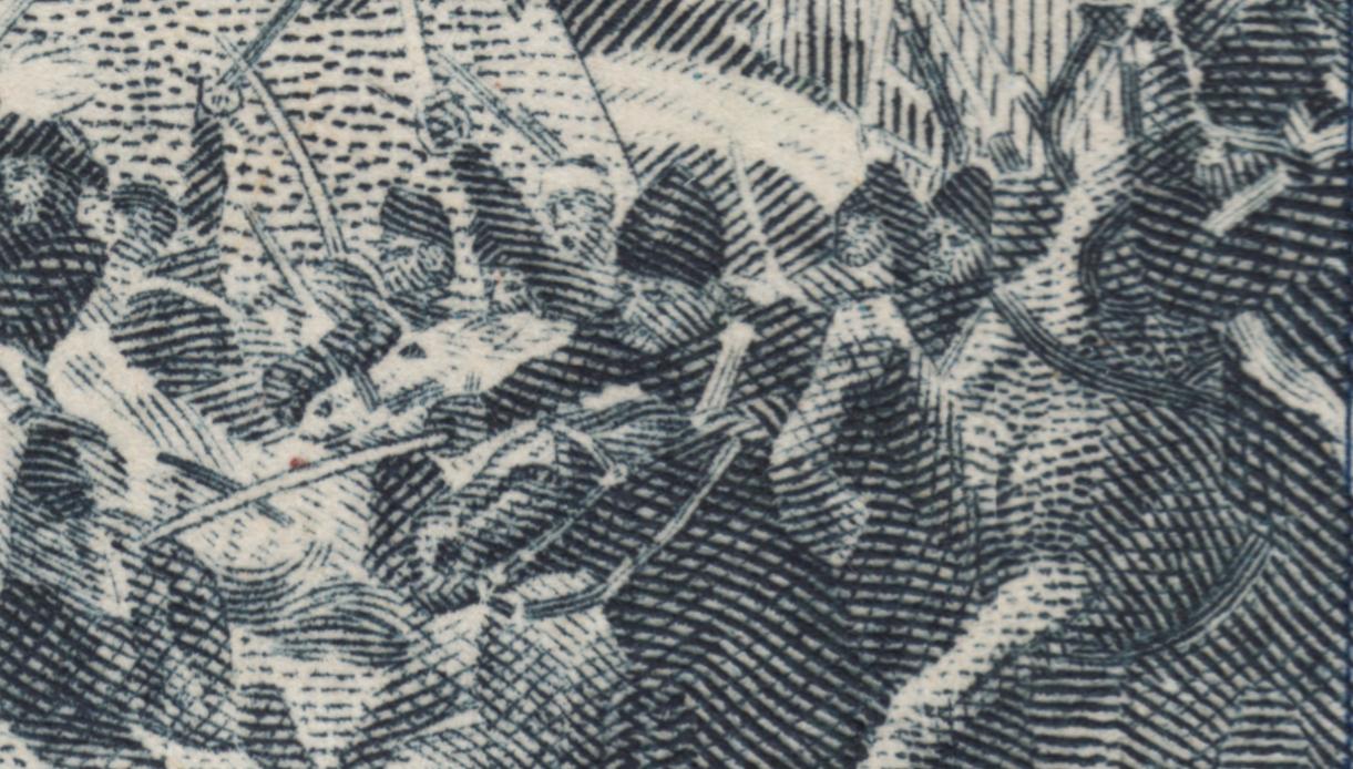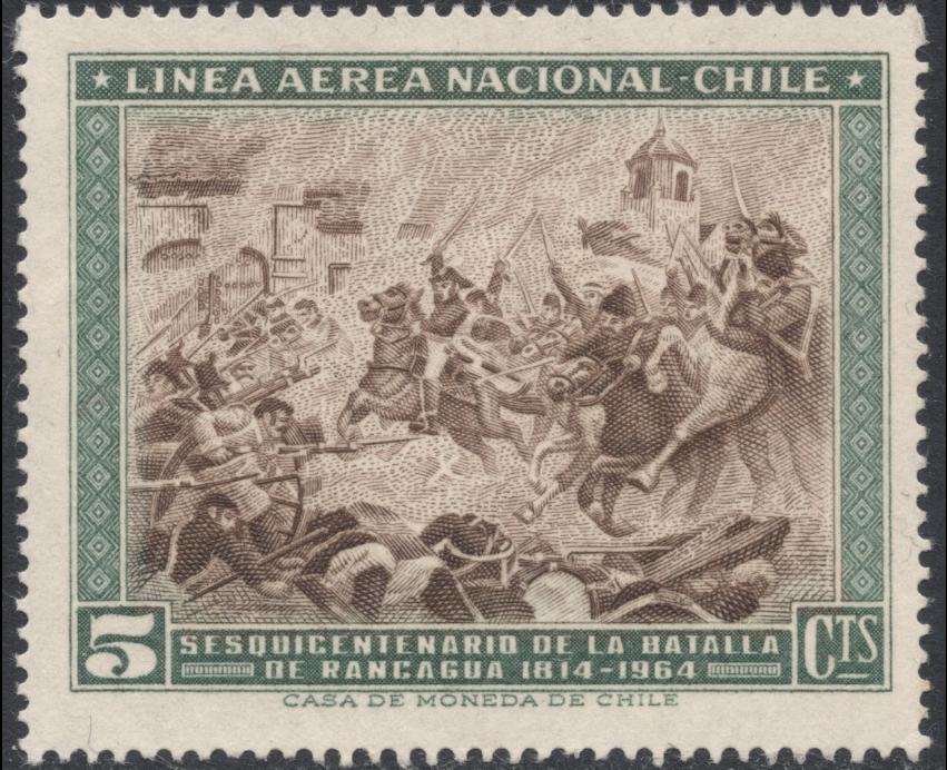 Aunque más adelante enfrentaremos con la amplitud que merece la tarea grata de mostrar la obra de José Moreno Benavente, me es imposible resistirme a un primer avance, a un sondeo rápido y auscultador. Por los datos que ofrece ese magnífico artículo que Centauro nos ha acabado de completar, no sé si es muy aventurado decir que este gran grabador llegó a ejecutar, en distintos años, tres grabados diferentes con el mismo motivo, dos de ellos destinados a sellos postales y el otro al reverso de un billete: la batalla de Rancagua, inspirado en el óleo de Pedro Subercaseaux titulado Carga de O'Higgins en Rancagua. Hacemos votos para que Jorgesurcl, que debe conocer mejor que nadie la obra de Moreno Benavente, pase por aquí y nos confirme o corrija este texto, tenemos dudas de que los tres grabados sean obra de Benavente, aunque por el estilo recio, lo parecen.