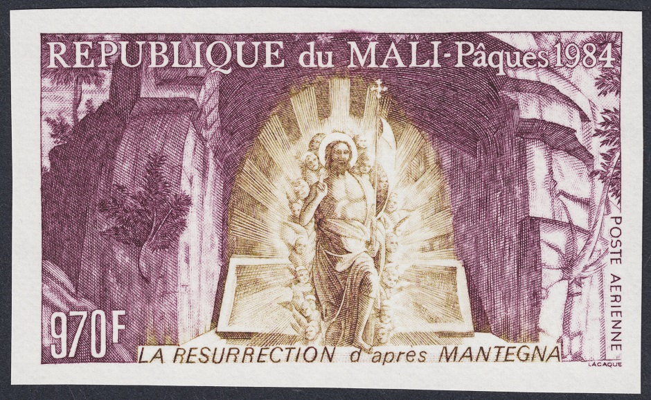 Muestro uno de los sellos de Egène Lacaque prometidos, este emitido por Mali en 1984. Inspirado en la obra Resurrección, de Andrea Mantegna, es un ejemplo notable de la finura virtuosa de este gran artista, siempre insinuador de poesía, esa cosa liviana, alada y sagrada.