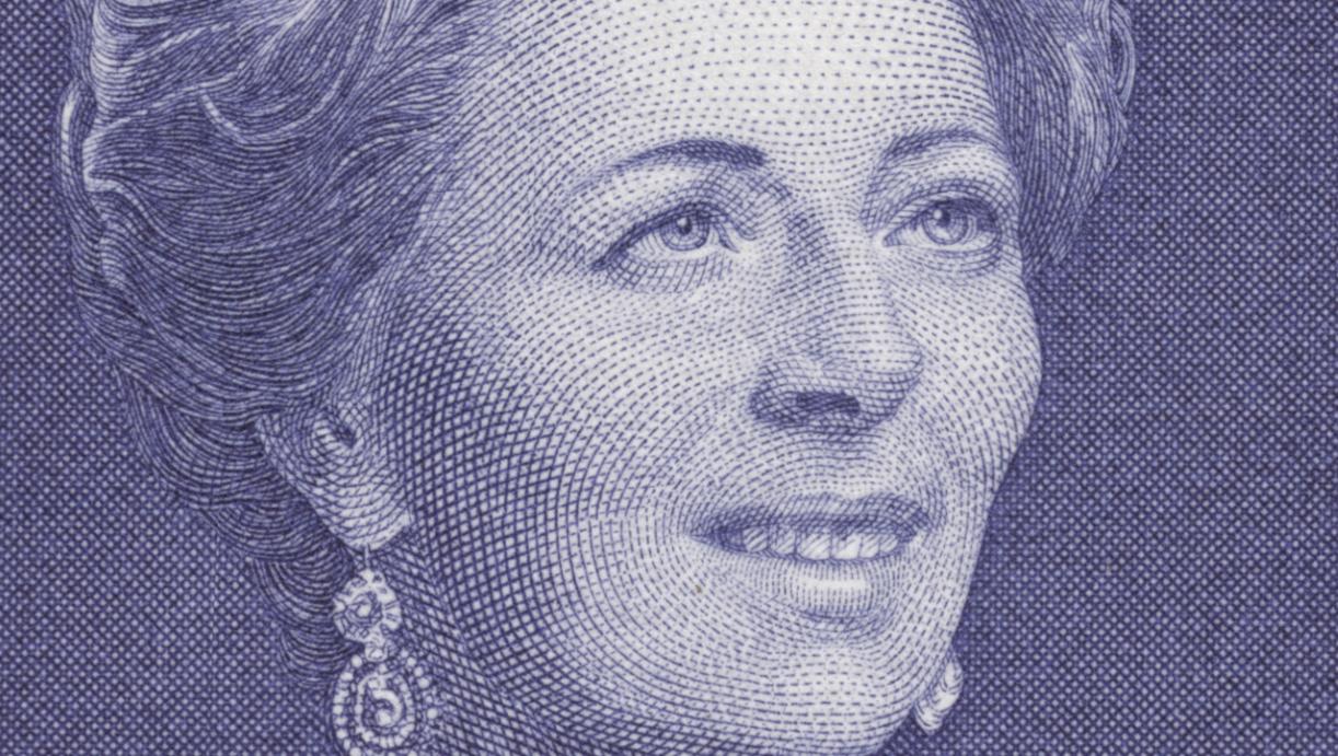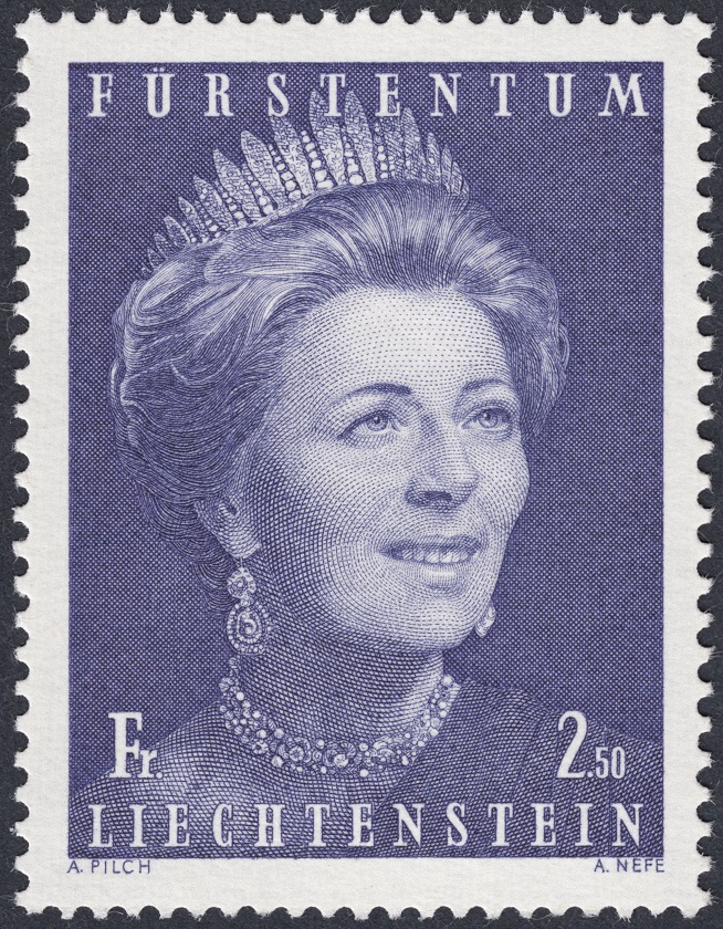 Y nos vamos al otro lado del río, en cuanto a estilo se refiere. De la talla impetuosa de Moreno Benavente al grabado primoroso de la escuela austríaca. Soberbio grabado de Alfred Nefe de la princesa Gina, afortunada modelo de este gran artista, como se puede ver comparando una fotografía de la época y debajo la obra del grabador en este sello de 1970. Obra en la que, nobleza de contemplador agradecido obliga, hemos de reseñar lo que parece un uso excesivo del compás en el modelado del rostro de la princesa de Liechtenstein. Y ello a su vez no hace sino reafirmarnos en una idea muy asentada que tenemos: que el grabador es responsable absoluto de su obra, y por ende del sello entendido como obra de arte soberana.