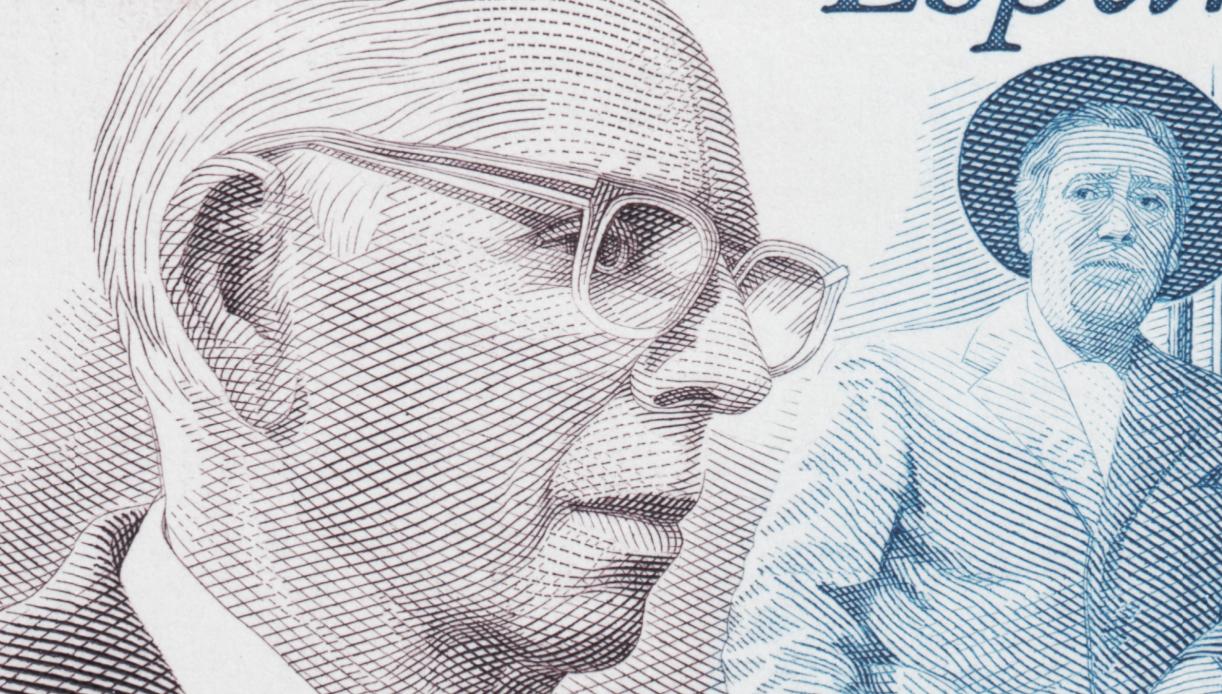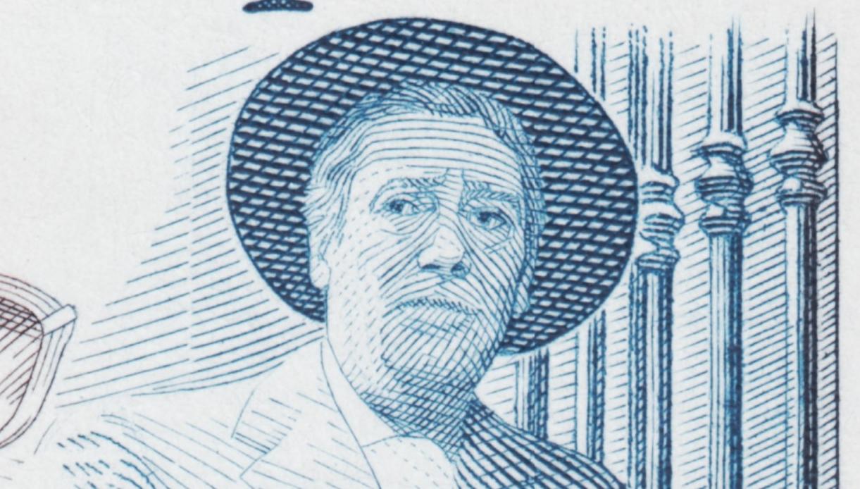 Añadimos otra obra maestra de Alfredo de Oro Sanz, realizada con la colaboración de Juan Carlos Heras Vicario (Madrid, 1961), como en la gran talla de los Reyes españoles de 2004. Este gran sello calcográfico fue emitido por España en 1997 y rinde tributo al escritor José María Pemán y a su creación más popular, El Séneca.