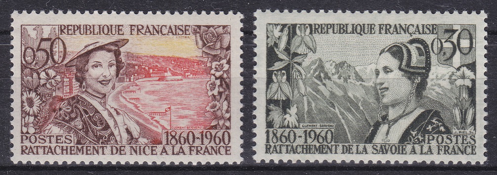 Cinco sellos franceses más, uno de Jean NICOT (COMBET), dos de preciosas mujeres floreadas (COMBET y PIEL) y dos de dos satélites (D1 y A1).
