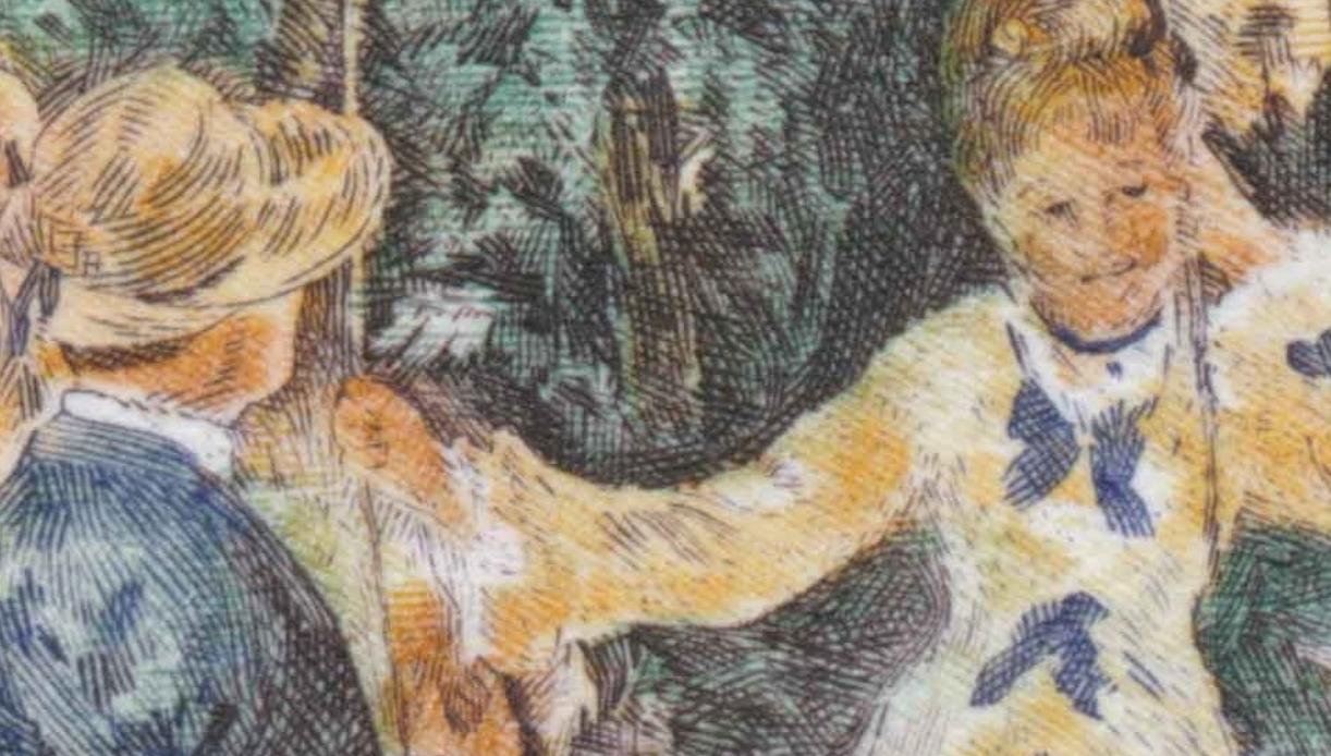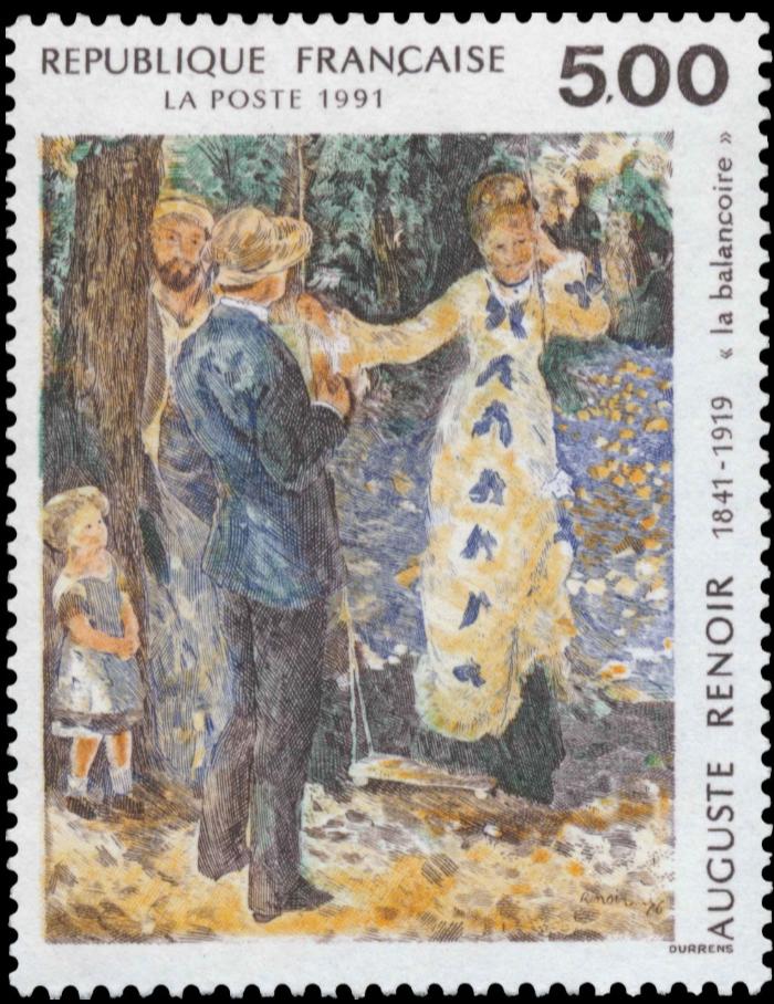 Valga como buen ejemplo de esta categoría notable uno de los mejores grabados de su última etapa creativa. Sello calcográfico emitido por Francia en 1991, a partir de una de las obras más famosas de Auguste Renoir, El columpio, óleo sobre lienzo de 1876.