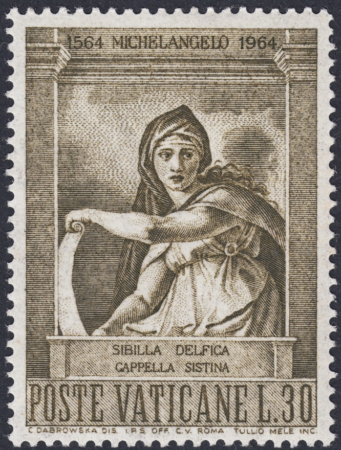 Completan la serie estos dos sellos: los dedicados al profeta Joel y a la bella Sibila de Delfos. De este último sello se ocupa Tullio Mele, que incide en el acero el estilo escultural de Miguel Ángel con una sencillez delicada y tenue. Una interpretación limpia y pulimentada. Excelente.