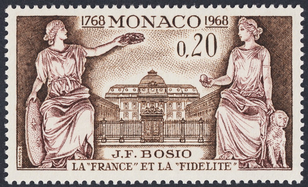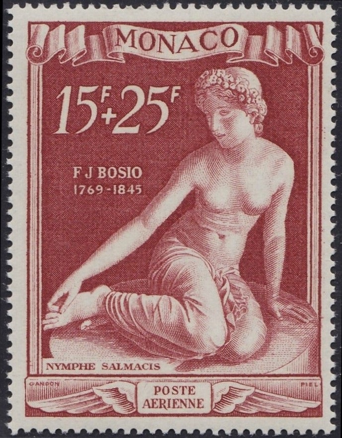 Esta serie de Mónaco, emitida en 1948 para honrar a su escultor más eminente, François Joseph Bosio (1768-1845), cumple esa conveniencia artística de un modo estricto. El encargado del diseño, y es de suponer que en el más amplio sentido, dado su magisterio, es Pierre Gandon, que no graba ninguno de los seis sellos que forman esta serie de nueve valores.