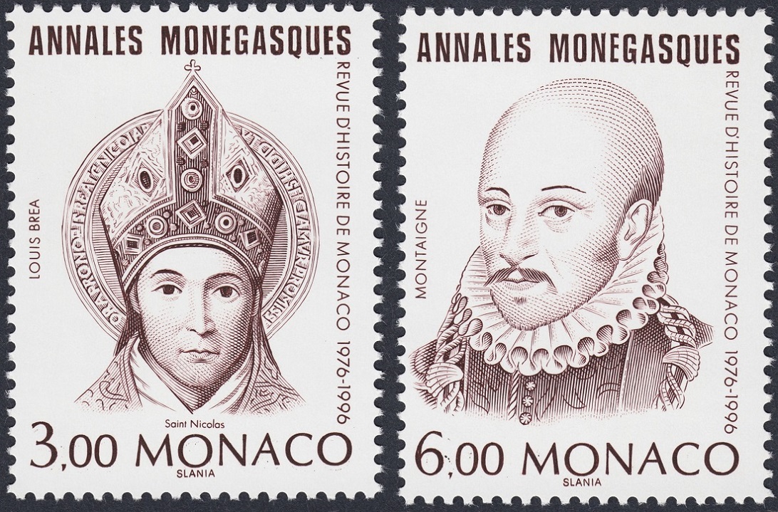 Aparte del grabado de Slania de 1996, inspirado en la obra atribuida a Daniel Dumonstier, de Michel de Montaigne ya había emitido Mónaco un sello. Fue en 1980, y su autor es Pierre Gandon, que se inspira en un aguafuerte de época para una edición de los Ensayos del gran escritor. Es un grabado muy esculpido, sobrio y elevado, una de las últimas obras de Gandon. Un legado esencial y depurado de su magisterio artístico.