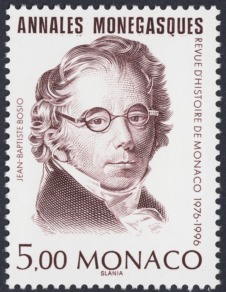 El sello mostrado del escultor Bosio y grabado por Slania, pertenece a una serie que Mónaco emitió en 1996 para conmemorar el XX Aniversario de la revista Anales monegascos. La serie está formada por ocho grandes personalidades relacionadas de algún modo con el Principado, y todos los sellos son obra de Slania, que entonces entraba en la última fase de su carrera artística incomparable.