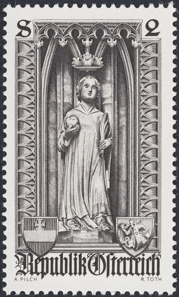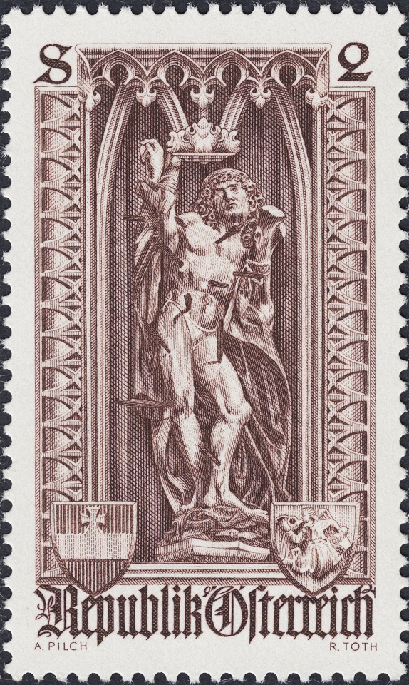 El sello de la entrada anterior forma parte de una serie de seis sellos dedicada a ensalzar algunas de las estatuas de la impresionante Catedral de Viena. Emisión ambiciosa de Austria que alcanza una proyección descollante a través del talento de Rudolf Toth, grabador de todos los sellos de la serie y entonces, año 1969, en plena madurez.