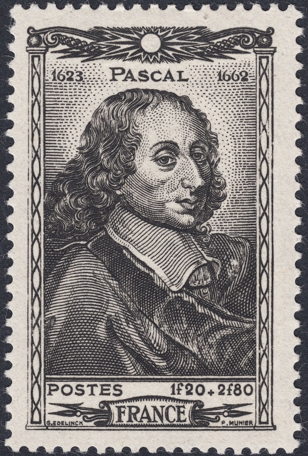 Y en primer lugar enseñamos uno de sus grabados más importantes: el sello de Blaise Pascal (*), de 1944. Munier recrea el grabado que de este filósofo imprescindible hizo Gérard Edelinck (1649-1707) casi tres siglos antes. Es un volcado depurador que hace brotar del acero un retrato cerrado y elegante. Una obra maestra de este grabador encomiable.