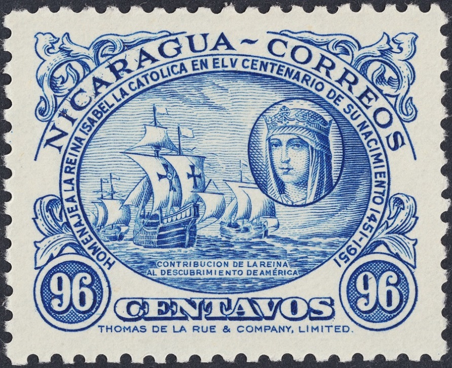 Continuamos en el espacio del grabado anglosajón, en este caso es la casa, inglesa también, Thomas de la Rue, la encargada de esta serie excelente que Nicaragua emitió en 1951, conmemorando el V Centenario del nacimiento de Isabel la Católica.