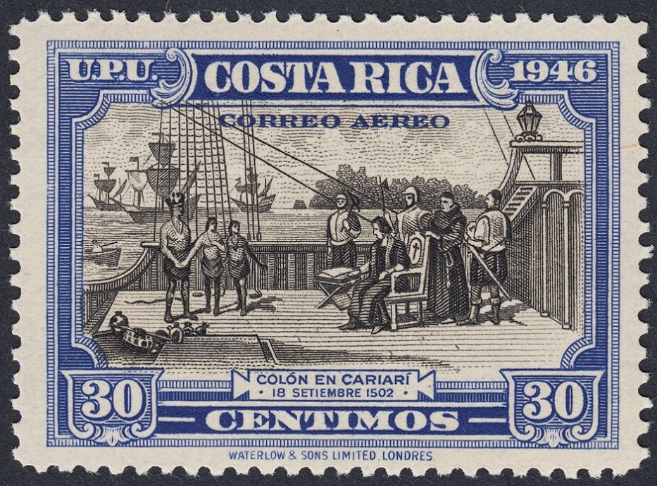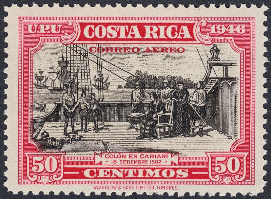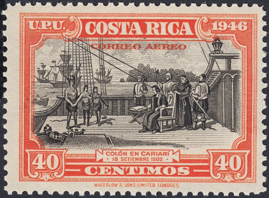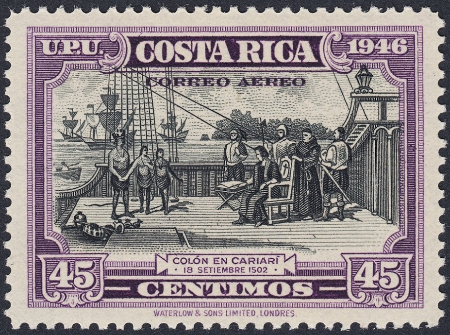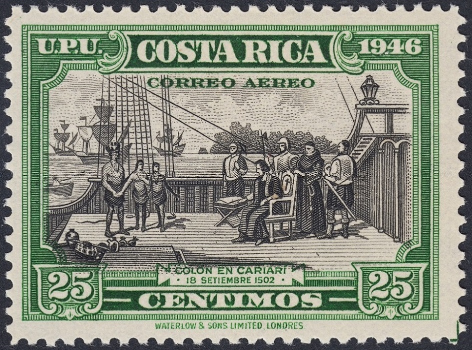 Y ahora una serie, esta de Waterlow & Sons, como la de Roosevelt, emitida por Costa Rica en 1946: Colón en Cariarí. Excelente composición, y muy representativa del grabado anglosajón: expresividad en la viñeta, conseguida con una talla parca y suficiente, y marco contundente y sobrio, a la par que muy artístico. ¡Soberbios!