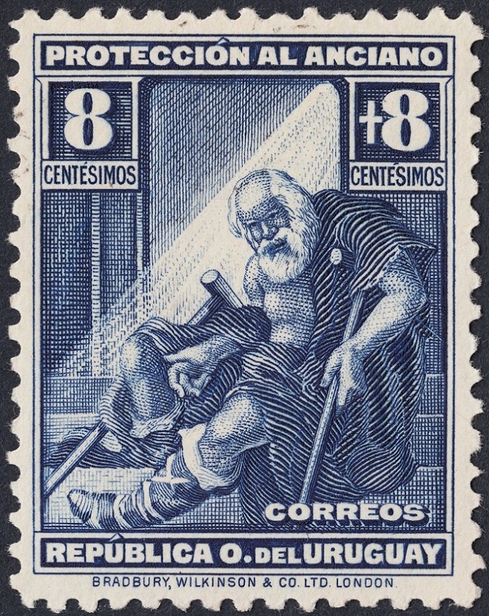 Debajo mostramos otros dos ciertamente notables. En último lugar el dedicado a Roosevelt, práctica habitual en aquella época, emitido en 1953 y uno de los tres valores de la serie, de Waterlow & Sons también. Antes, el excelente sello social de ayuda al anciano. Es uno de los cuatro valores iguales de la serie, impresa en 1930, y diseñada y grabada por la casa inglesa Bradbury y Wilkinson. ¡Y es un sello soberbio y maravilloso! Un grabado endurecido y elocuente que conmueve e impresiona.