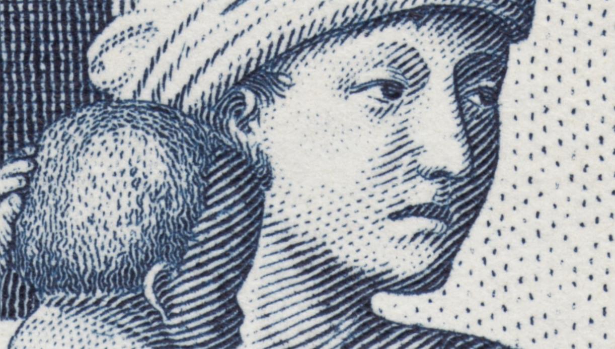 El último sello, también de Rita Morena e imprimido con el mismo método dos años antes (2000) por Italia, recrea una de las vírgenes con el niño del pintor renacentista Carlo Crivelli. Talla y diseño aunados con acierto por Morena, que consigue una composición insinuante y audaz.