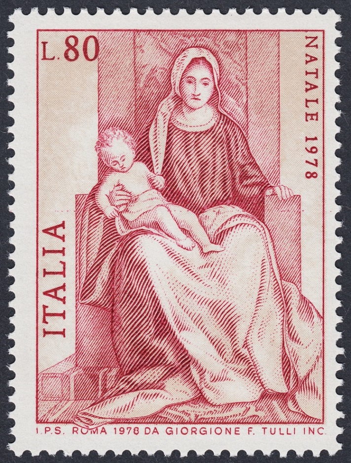 Otro caso similar, en este sello emitido por Italia también en 1978. Los artistas implicados son ahora Giorgione, con su obra Pala de Castelfranco, que representa a la Virgen en el trono con el niño Jesús, y el grabador Francesco Tulli.