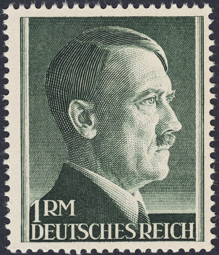 Antes de su contribución mencionada a la serie de 1943, presentamos uno de los perfiles filatélicos más famosos del genocida alemán. En la segunda imagen que mostramos, y que procede del blog de Adrian que varias veces ya hemos recomendado (**), se puede ver en la parte inferior su autoría indiscutible. Y exponemos primero lo que, aún pareciendo el mismo grabado, tiene muy ligeras diferencias que, sin embargo, no parecen suficientes como para discutir la autoría de Lorber. Es uno de los valores altos de la serie larga que empezó a emitirse en Alemania en 1941. El borde de pliego fue emitido para la ocupación de nazi de Polonia en abril de 1943, con ocasión del cumpleaños de Hitler. Para este General Gouvernement, precisamente, talló Lorber un puñado de retratos magistrales, algunos de los cuales fueron expuestos páginas atrás (*).
