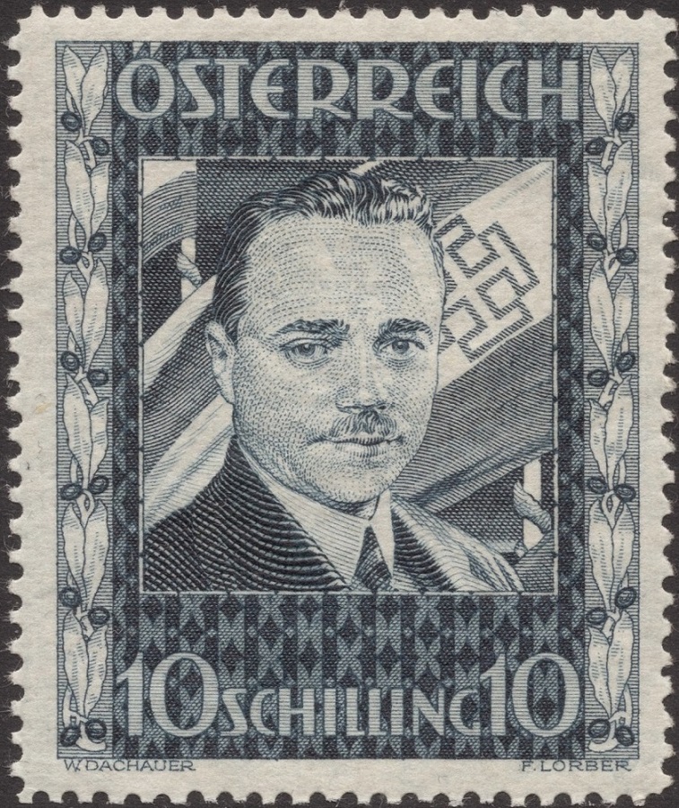 Detrás añadimos un sello mítico, por su valor intrínseco y también económico, de la filatelia austríaca: el emitido en 1936 para rendir tributo al político Engelbert Dollfuss (3), asesinado dos años antes, precisamente, por miembros del partido nazi austríaco. ¡Tiempos tétricos en la vieja Europa! El grabado compaginado de Lorber y el diseño elegante de Wilhelm Dachauer (1881-1951), también pintor de fuste, crean un sello coherente desde el punto de vista estético y de una relevancia artística incontestable.