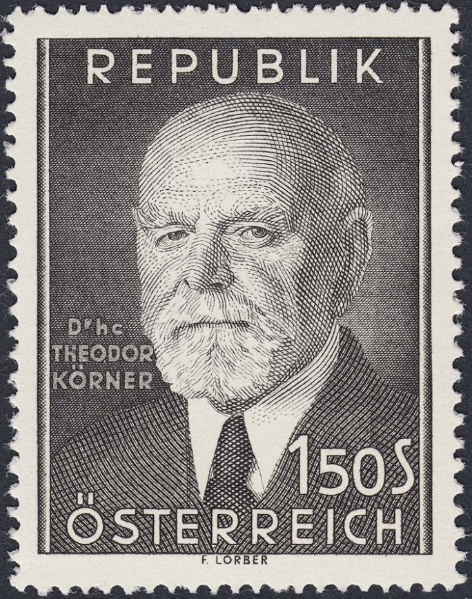 Sumamos cinco retratos más de Lorber, todos ellos emitidos por Austria entre 1947 y 1953-57. Se podrá objetar, acaso, que por qué esta predominacia abusiva de retratos en la obra de Lorber. Es muy sencillo: durante los años prolíficos de este grabador, entre 1930 y 1951 principalmente, la filatelia de Austria fue muy poco paisajística en sus emisiones calcográficas, fuente esencial de belleza y verdad artísticas en el sello postal.