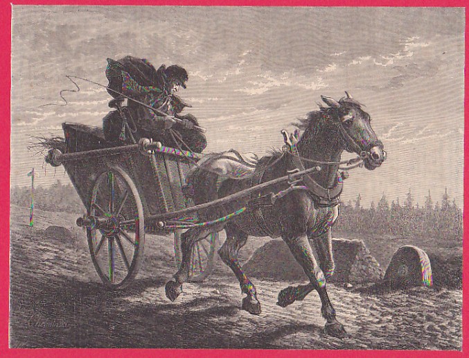 Un pequeño receso para añadir una imagen que acabo de encontrar en el Tema vecino de Ambrosías Postales. Allí fue puesta por Quinosollana: Xilografia de una pintura del pintor polaco Józef Chełmoński (1849-1914) titulada "Coche de Postas". Esta es sin duda la obra, o al menos una recreación primera, en la que se inspira un gran sello calcográfico de Polonia que pusimos en las primeras páginas de este Tema y del que lamentábamos entonces no tener su fuente. Ponemos aquí ambos, fuente y sello (emitido en 1961, dos sellos con el mismo valor y distinto color, grabado de Jerzy Miller), y remitimos a aquella entrada para las capturas detalladas: