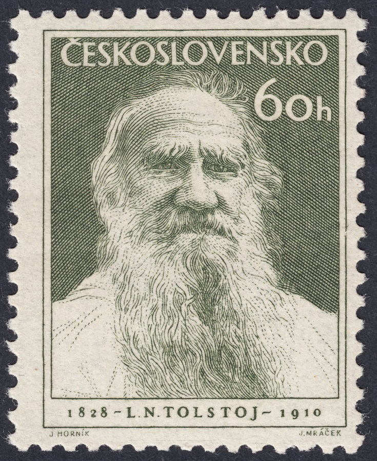 La Unión Soviética dedicó, en la época de mayor esplendor de sus emisiones en huecograbado, varios sellos al más imperial de sus escritores. Pero quizá el mejor sello dedicado a Tolstoi sea este de 1978. Es un sello calcográfico de gran tamaño, de factura material óptima y de realización artística impecable. De esta última es autor Ivan Mikhailovich Mokrousov, que talla al novelista con severidad y holgura. Un grabado contundente y extenso que realza el aire patriarcal del gran coloso de la novela.