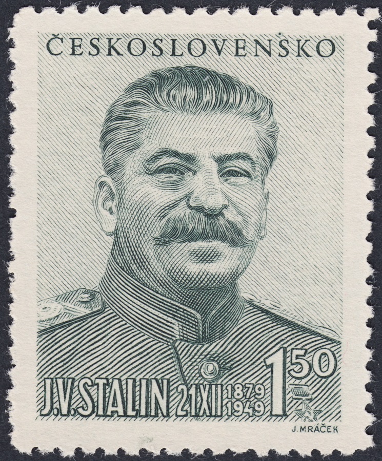 Durante los quince años siguientes, sin contar los gestos filatélicos de fraternidad hacia la revolución comunista y sus símbolos, sólo ya Stalin fue objeto de no menos de una decena de sellos. Los primeros fueron emitidos en 1949, para celebrar el 70 cumpleaños del ogro de Moscú. Y los grabadores implicados en los dos sellos creados (en tres valores) fueron Jan Mracek y ¡Jindra Schmidt! La exclamación tiene su razón de ser. Jindra, que, como ya hemos hecho constar en este Tema (*), hubo de grabar a Hitler en 1943 y después, en 1947, los sellos de homenaje a las víctimas de una de las matanzas ordenadas por él (Lidice, 1942), y que lo hizo precisamente para un sello que celebraba su cumpleaños (54), ahora hubo de hacer lo propio con Stalin. ¡Otra vez el mismo martirio!, bien que ahora con las apariencias salvaguardadas por la Guerra Fría incipiente y también por las maneras inmisericordes del nuevo padre sobrevenido.