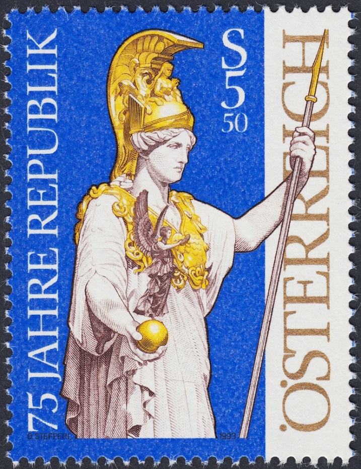 Por último, agregamos un sello emitido por Austria en 1993 y que celebra el 75 Aniversario del régimen republicano a través de la estatua de Palas Atenea, que está delante del Parlamento Nacional (Viena), cuyo edificio ha sido expuesto en estas páginas, en vistas frontales, a través de los sellos magistrales de Ranzoni, Leitgeb y Nefe (***). Impresión mixta de calcografía y huecograbado, y grabado extraordinario de Stefferl, realzado por los colores de la emisión, que sin embargo permiten apreciar el valor artístico de la talla pormenorizada y cuidadosa de este autor fundamental.