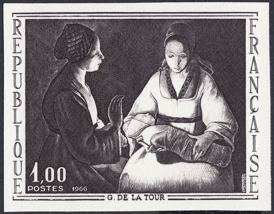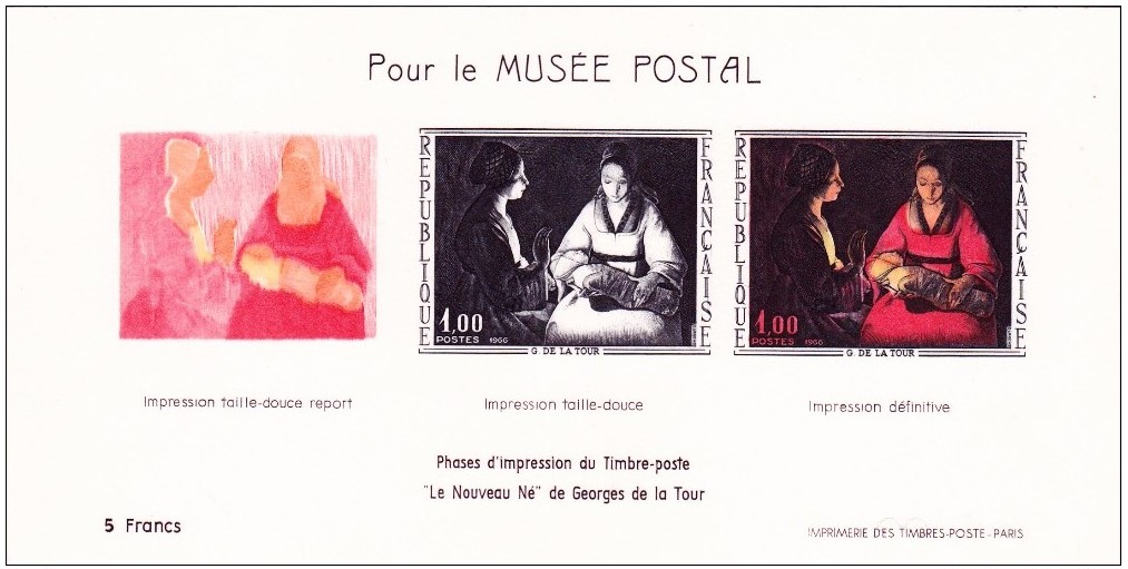 Francia emitió esta hojita en 1966 como complemento al sello dedicado al óleo de Georges De La Tour, El recién nacido. En ella, tal vez con la intención real de explicar en tres imágenes el proceso creativo del sello, se expone en realidad, y en efecto tal y como se expresa al pie de la hojita, el proceso estrictamente calcográfico. Nosotros hemos intercambiado el orden de la primera y de la segunda imagen, y además agregamos la obra original de De La Tour en primer lugar. De este modo, visualizamos mejor algunos momentos claves del proceso creativo en sí mismo.