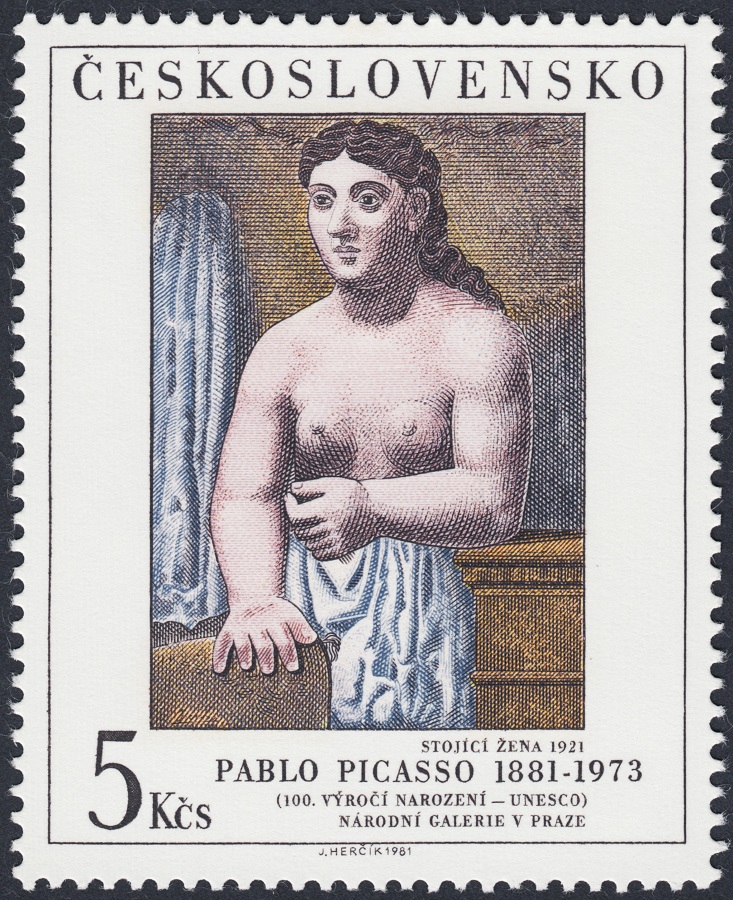 Herčík, por su parte, aferra las deformidades de Picasso en esta obra de 1921, Mujer de pie (Galería Nacional de Praga), y consolida en la talla, difundida y vigorosa, el estilo escultural y pesado del artista malagueño en este lienzo pintado con témpera. Excelente proyección filatélica de Herčík, que acota con el buril las formas abrumadoras del retrato de Picasso.