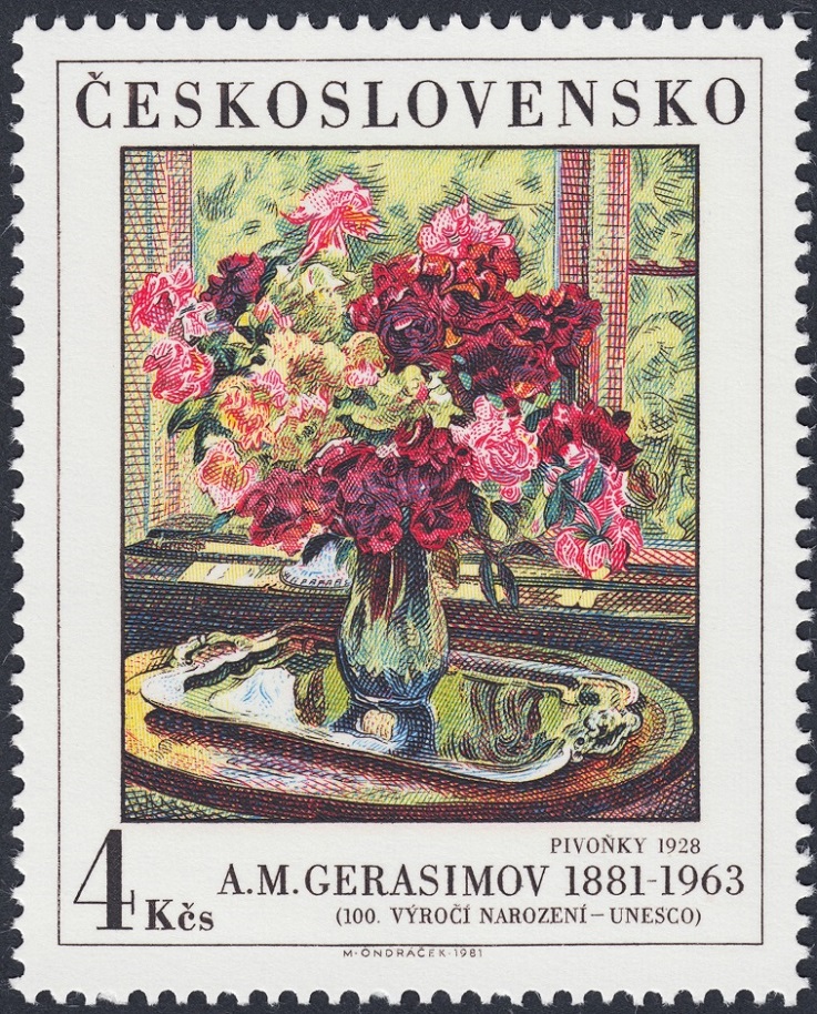 Ondráček, quizá el grabador más prolífico de la filatelia checa del último cuarto de siglo, y por generación quien acaso más sellos de esta tipología calcográfica ha grabado junto a, precisamente, Herčík, vierte sobre el acero las flores de Gerasimov (1881-1963) y extrae de ese espejo propicio un grabado terso y reverberante. Una mutación auroral que se alza después en la exposición calcográfica con un ímpetu jovial y frondoso. Delicioso brote primaveral.