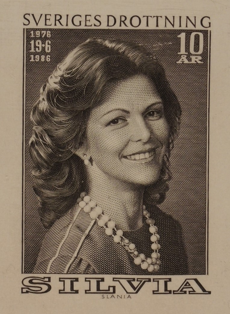 El buril mágico de Slania tuvo una princesa, Grace Kelly, y una reina: Silvia de Suecia, de la que acabamos de ver esa maravillosa viñeta con que este artista opulento celebró el décimo aniversario de su reinado eterno. Y es que Silvia fue coronada en 1976, justo cuando Slania tenía muy establecida ya su supremacía artística en la filatelia de Suecia.